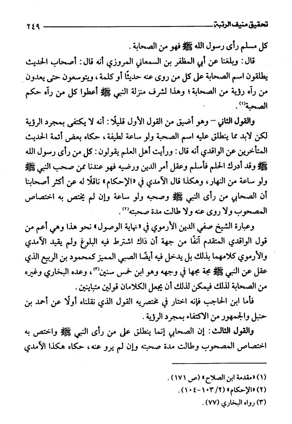 وعبارة الشيخ صفي الدين الأرموي في "نهاية الوصول" نحو هذا وهي أعم من قول الواقدي المتقدم آنفًا من جهة أن ذاك اشترط فيه البلوغ ولم يقيد الآمدي والأرموي كلامهما بذلك بل يدخل فيه أيضًا الصبي المميز كمحمود بن الربيع الذي عقل عن النبي -صلى اللَّه عليه وسلم- مجة مجها في وجهه وهو ابن خمس سنين (¬3)، وعده البخاري وغيره من الصحابة لذلك فيمكن لذلك أن يجعل الكلامان قولين متباينين.