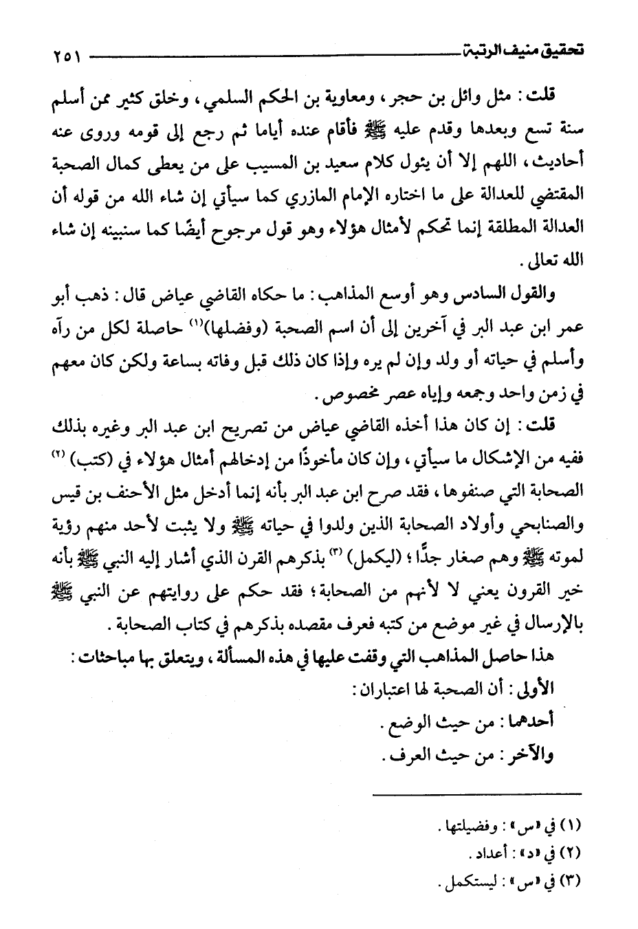 قلت: مثل وائل بن حجر، ومعاوية بن الحكم السلمي، وخلق كثير ممن أسلم سنة تسع وبعدها وقدم عليه -صلى اللَّه عليه وسلم- فأقام عند ثم أياما ثم رجع إلى قومه وروى عنه أحاديث، اللهم إلا أن يئول كلام سعيد بن المسيب على من يعطى كمال الصحبة المقتضي للعدالة على ما اختاره الإمام المازري كما سيأتي إن شاء اللَّه من قوله أن العدالة المطلقة إنما تحكم لأمثال هؤلاء وهو قول مرجوح أيضًا كما سنبينه إن شاء اللَّه تعالى.