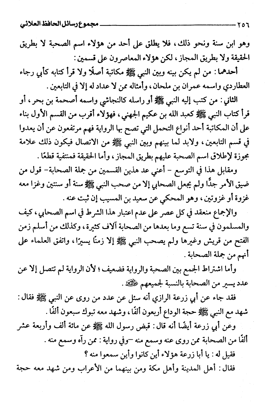 الثاني: من كتب إليه النبي -صلى اللَّه عليه وسلم- أو راسله كالنجاشي واسمه أصحمة بن بحر، أو قرأ كتاب النبي -صلى اللَّه عليه وسلم- كعبد اللَّه بن عكيم الجهني، فهؤلاء أقرب من القسم الأول بناء على أن المكاتبة أحد أنواع التحمل التي تصح بها الرواية فهم مرتفعون عن أن يعدوا في قسم التابعين، ولابد لما بينهم وبين النبي -صلى اللَّه عليه وسلم- من الاتصال فيكون ذلك علامة مجوزة لإطلاق اسم الصحبة عليهم بطريق المجاز، وأما الحقيقة فمنتفية قطعًا.