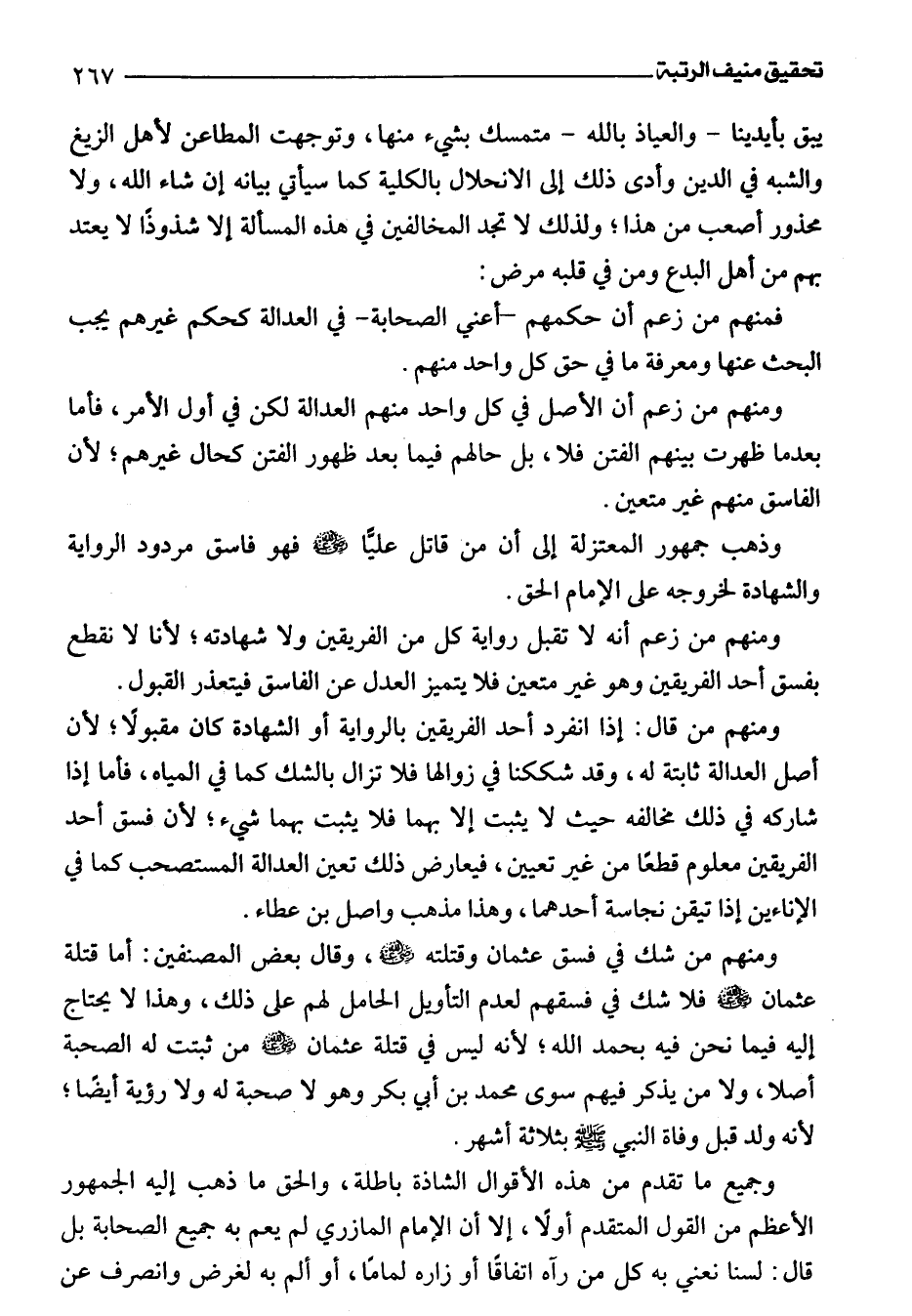 ومنهم من شك في فسق عثمان وقتلته -رضي اللَّه عنه-، وقال بعض المصنفين: أما قتلة عثمان -رضي اللَّه عنه- فلا شك في فسقهم لعدم التأويل الحامل لهم على ذلك، وهذا لا يحتاج إليه فيما نحن فيه بحمد اللَّه؛ لأنه ليس في قتلة عثمان -رضي اللَّه عنه- من ثبتت له الصحبة أصلا، ولا من يذكر فيهم سوى محمد بن أبي بكر وهو لا صحبة له ولا رؤية أيضًا؛ لأنه ولد قبل وفاة النبي -صلى اللَّه عليه وسلم- بثلاثة أشهر.
