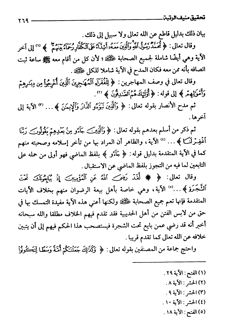 وقال تعالى: {لَقَدْ رَضِيَ اللَّهُ عَنِ الْمُؤْمِنِينَ إِذْ يُبَايِعُونَكَ تَحْتَ الشَّجَرَةِ}. . . (¬5) الآية، وهي خاصة بأهل بيعة الرضوان منهم بخلاف الآيات المتقدمة فإنها تعم جميع الصحابة -رضي اللَّه عنهم- ولكنها أعني هذه الآية مفيدة التمسك بها في حق من لابس الفتن من أهل الحديبية فقد تقدم فيهم الخلاف مطلقا واللَّه سبحانه أخبر أنه قد رضي عمن بايع تحت الشجرة فيستصحب هذا الحكم فيهم إلى أن يتبين خلافه عن اللَّه تعالى كما تقدم قريبا.