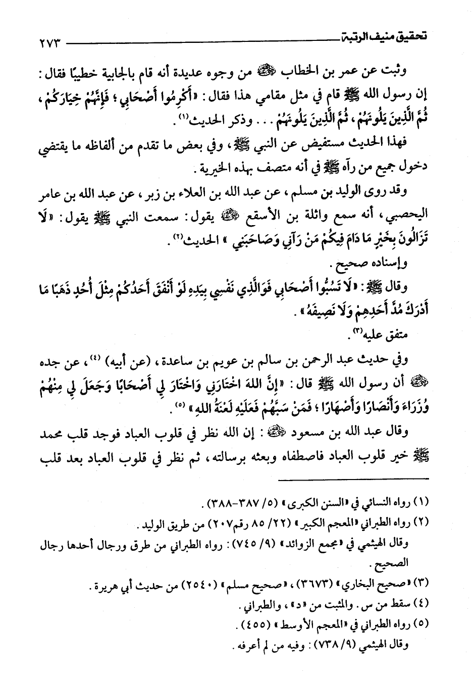 وقال -صلى اللَّه عليه وسلم-: "لا تَسُبُّوا أَصْحَابِي؛ فَوَالَّذِي نَفْسِي بِيَدِهِ لَوْ أَنْفَقَ أَحَدُكُمْ مِثْلَ أُحُدٍ ذهبًا مَا بَلَغَ مُدَّ أَحَدِهِم وَلَا نَصِيْفَهُ".