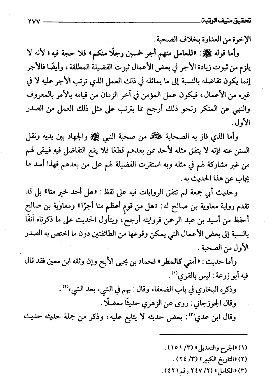 وحديث أبي جمعة لم تتفق الروايات فيه على لفظ: "هل أحد خير منا" بل قد تقدم رواية معاوية بن صالح له: "هل من قومٍ أعظم منا أجرًا" ومعاوية بن صالح أحفظ من أسيد بن عبد الرحمن فروايته أرجح، ويتأول الحديث على ما ذكرناه آنفا بالنسبة إلى بعض الأعمال التي يمكن وقوعها من الطائفتين دون ما اختص به الصدر الأول من الصحبة.