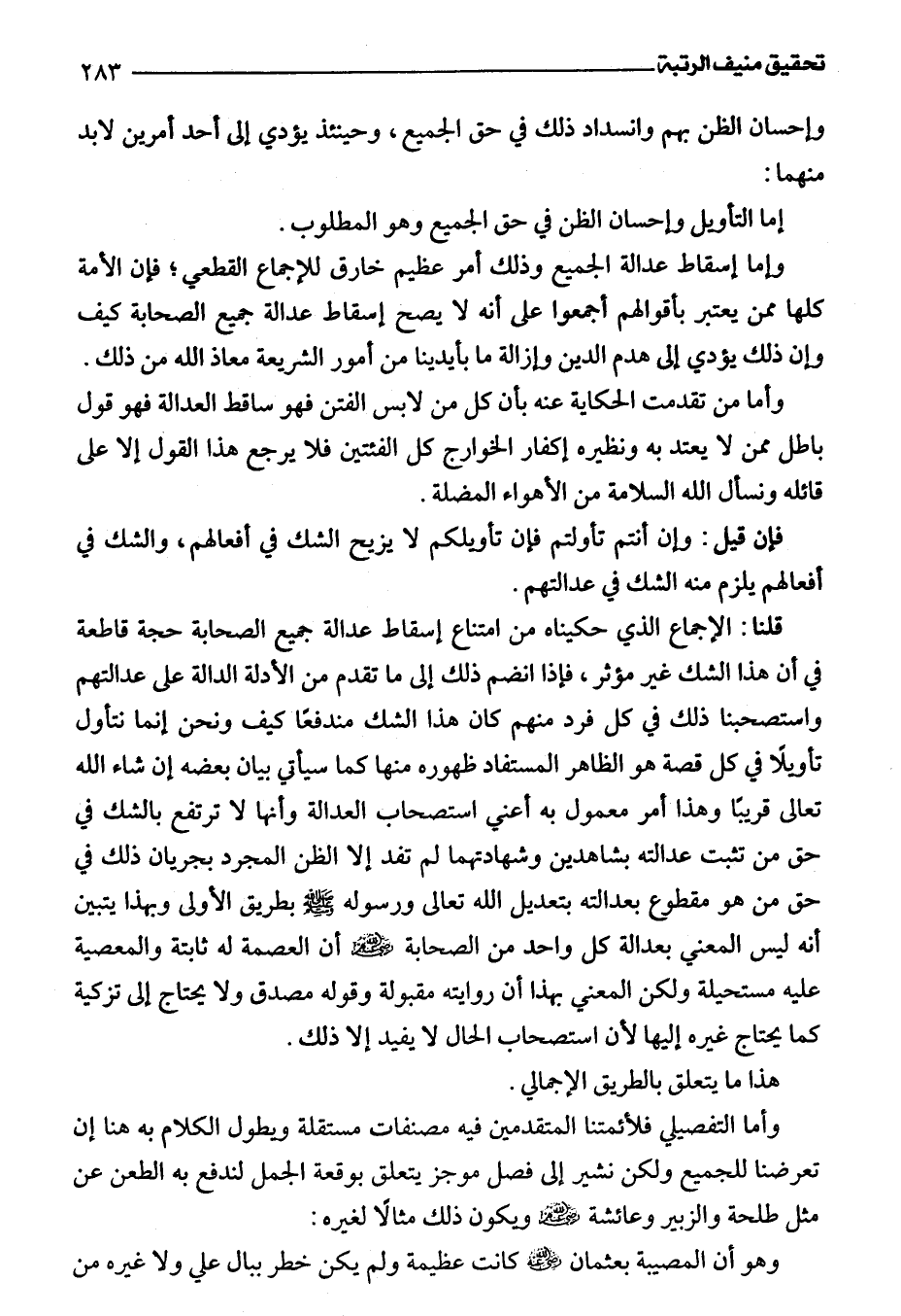 وإما إسقاط عدالة الجميع وذلك أمر عظيم خارق للإجماع القطعي؛ فإن الأمة كلها ممن يعتبر بأقوالهم أجمعوا على أنه لا يصح إسقاط عدالة جميع الصحابة كيف وإن ذلك يؤدي إلى هدم الدين وإزالة ما بأيدينا من أمور الشريعة معاذ اللَّه من ذلك.
