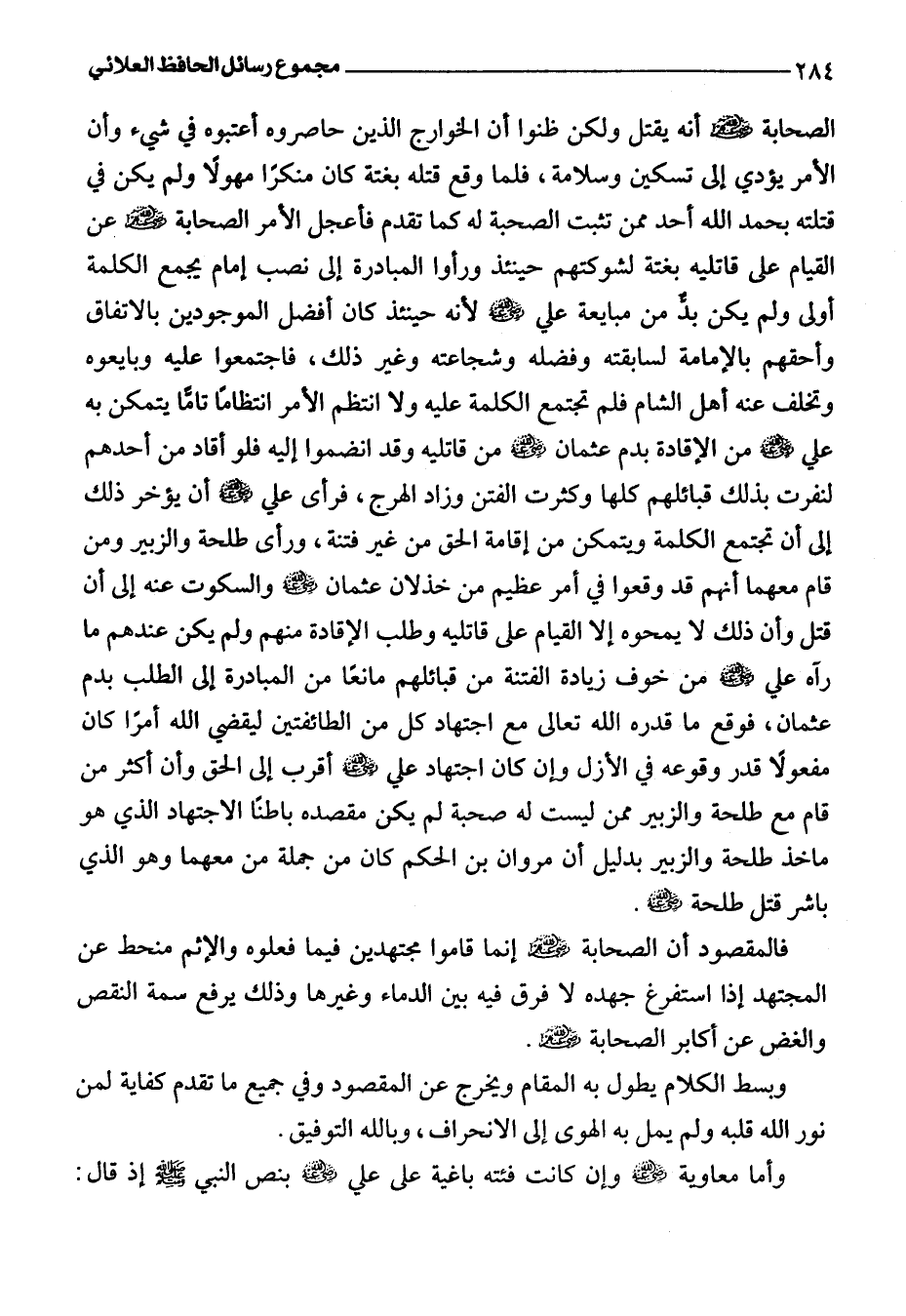 الصحابة -رضي اللَّه عنهم- أنه يقتل ولكن ظنوا أن الخوارج الذين حاصروه أعتبوه في شيء وأن الأمر يؤدي إلى تسكين وسلامة، فلما وقع قتله بغتة كان منكرًا مهولًا ولم يكن في قتلته بحمد اللَّه أحد ممن تثبت الصحبة له كما تقدم فأعجل الأمر الصحابة -رضي اللَّه عنهم- عن القيام على قاتليه بغتة لشوكتهم حينئذ ورأوا المبادرة إلى نصب إمام يجمع الكلمة أولى ولم يكن بدٌّ من مبايعة علي -رضي اللَّه عنه- لأنه حينئذ كان أفضل الموجودين بالاتفاق وأحقهم بالإمامة لسابقته وفضله وشجاعته وغير ذلك، فاجتمعوا عليه وبايعوه وتخلف عنه أهل الشام فلم تجتمع الكلمة عليه ولا انتظم الأمر انتظامًا تامًا يتمكن به علي -رضي اللَّه عنه- من الإقادة بدم عثمان -رضي اللَّه عنه- من قاتليه وقد انضموا إليه فلو أقاد من أحدهم لنفرت بذلك قبائلهم كلها وكثرت الفتن وزاد الهرج، فرأى علي -رضي اللَّه عنه- أن يؤخر ذلك إلى أن تجتمع الكلمة ويتمكن من إقامة الحق من غير فتنة، ورأى طلحة والزبير ومن قام معهما أنهم قد وقعوا في أمر عظيم من خذلان عثمان -رضي اللَّه عنه- والسكوت عنه إلى أن قتل وأن ذلك لا يمحوه إلا القيام على قاتليه وطلب الإقادة منهم ولم يكن عندهم ما رآه علي -رضي اللَّه عنه- من خوف زيادة الفتنة من قبائلهم مانعًا من المبادرة إلى الطلب بدم عثمان، فوقع ما قدره اللَّه تعالى مع اجتهاد كل من الطائفتين ليقضى اللَّه أمرًا كان مفعولًا قدر وقوعه في الأزل وإن كان اجتهاد علي -رضي اللَّه عنه- أقرب إلى الحق وأن أكثر من قام مع طلحة والزبير ممن ليست له صحبة لم يكن مقصده باطنًا الاجتهاد الذي هو ماخذ طلحة والزبير بدليل أن مروان بن الحكم كان من جملة من معهما وهو الذي باشر قتل طلحة -رضي اللَّه عنه-.