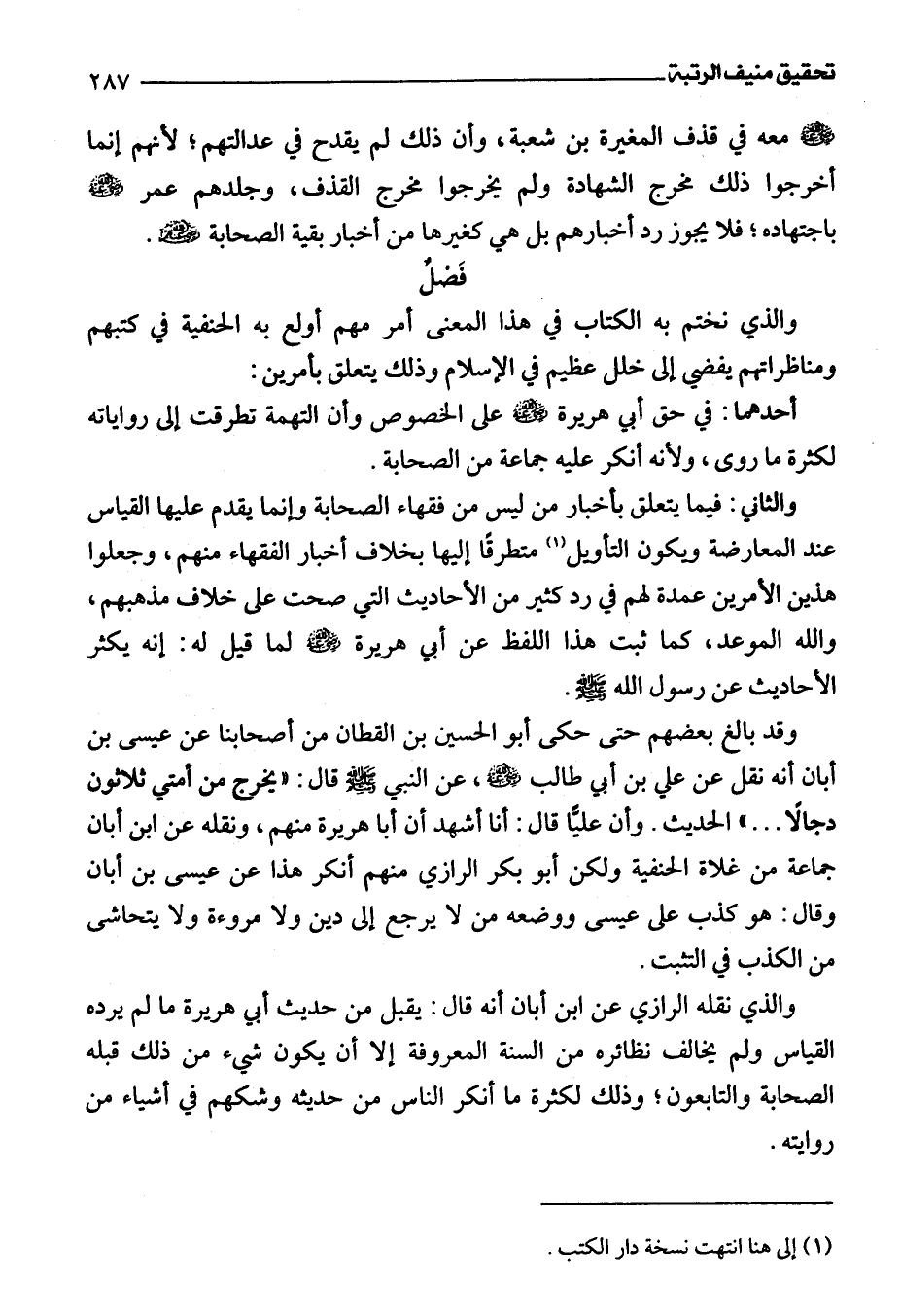 وقد بالغ بعضهم حتى حكى أبو الحسين بن القطان من أصحابنا عن عيسى بن أبان أنه نقل عن علي بن أبي طالب -رضي اللَّه عنه-، عن النبي -صلى اللَّه عليه وسلم- قال: "يخرج من أمتي ثلاثون دجالًا. . . " الحديث. وأن عليًّا قال: أنا أشهد أن أبا هريرة منهم، ونقله عن ابن أبان جماعة من غلاة الحنفية ولكن أبو بكر الرازي منهم أنكر هذا عن عيسى بن أبان وقال: هو كذب على عيسى ووضعه من لا يرجع إلى دين ولا مروءة ولا يتحاشى من الكذب في التثبت.