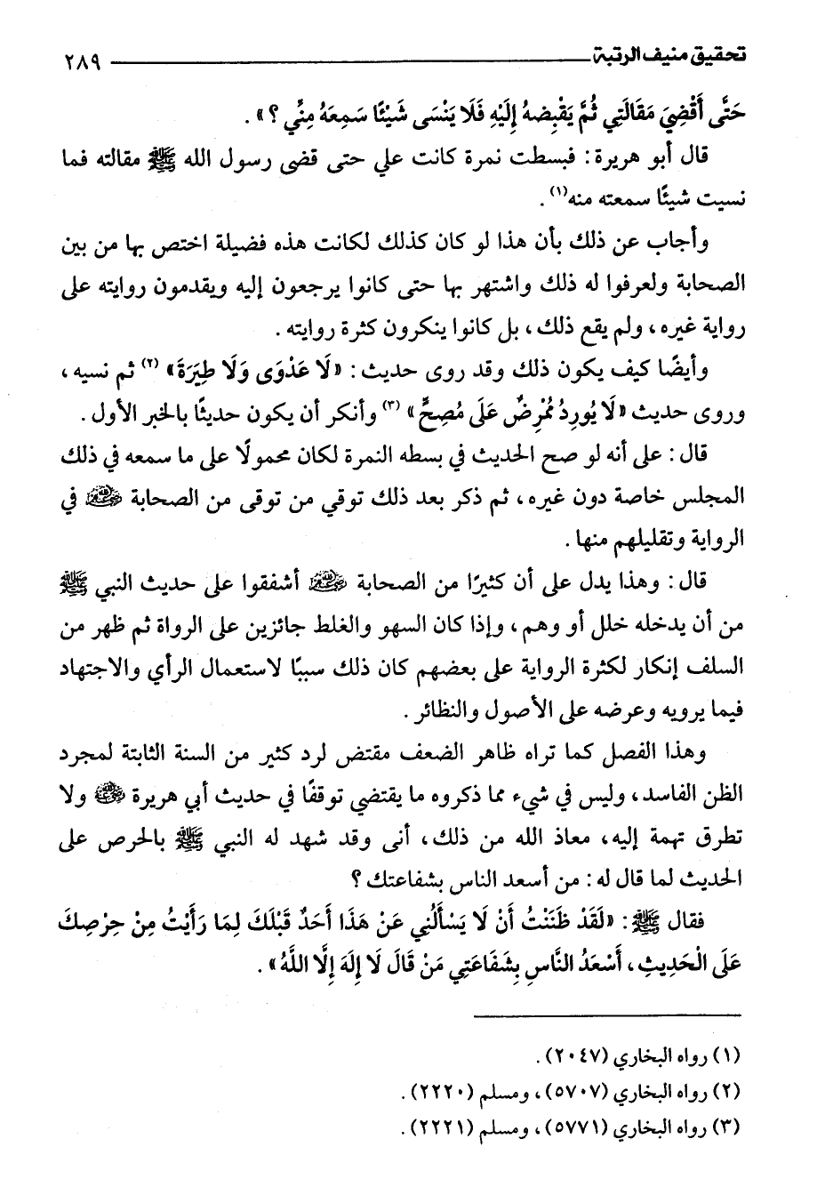 وهذا الفصل كما تراه ظاهر الضعف مقتض لرد كثير من السنة الثابتة لمجرد الظن الفاسد، وليس في شيء مما ذكروه ما يقتضي توقفًا في حديث أبي هريرة -رضي اللَّه عنه- ولا تطرق تهمة إليه، معاذ اللَّه من ذلك، أنى وقد شهد له النبي -صلى اللَّه عليه وسلم- بالحرص على الحديث لما قال له: من أسعد الناس بشفاعتك؟