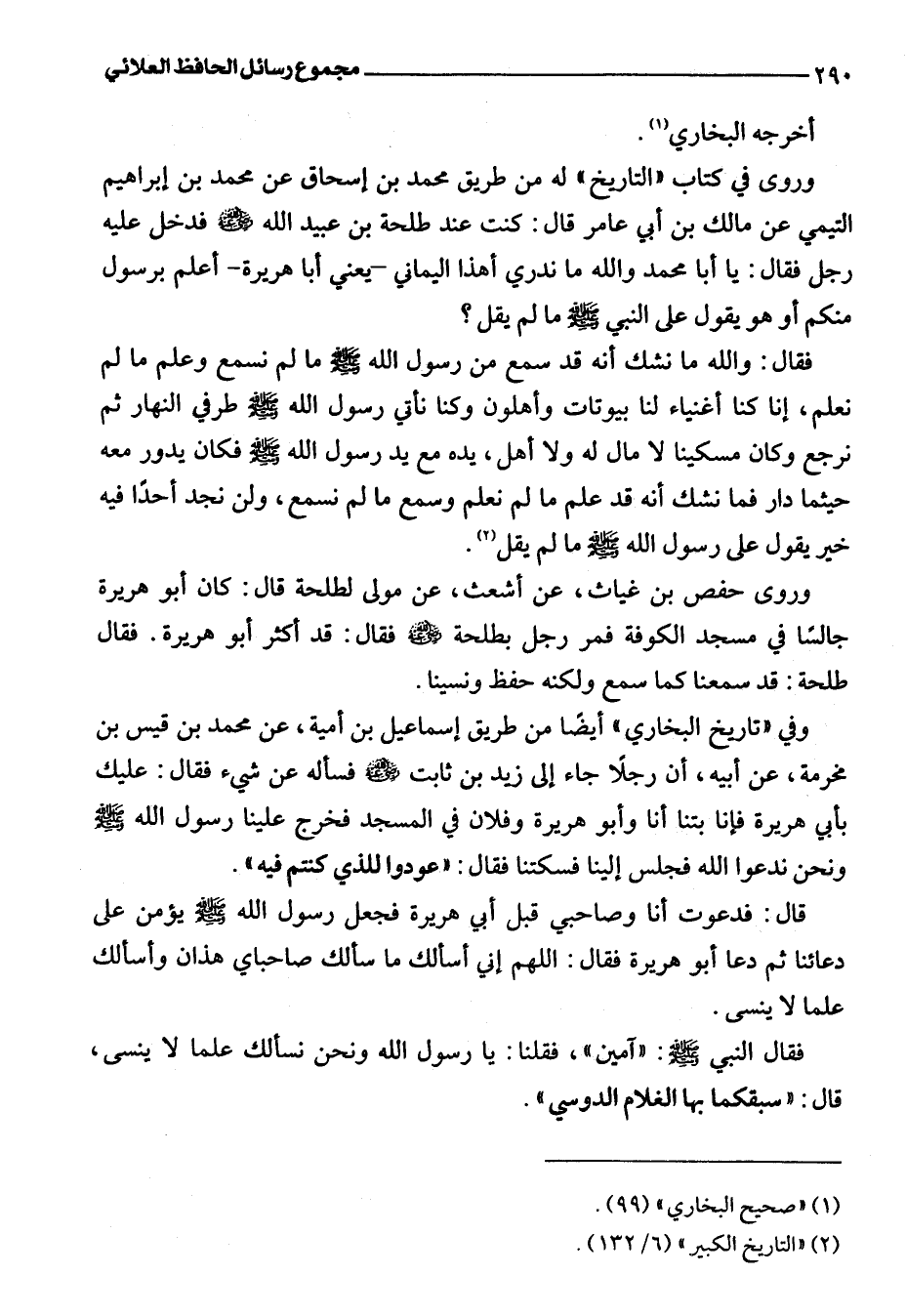 وروى في كتاب "التاريخ" له من طريق محمد بن إسحاق عن محمد بن إبراهيم التيمي عن مالك بن أبي عامر قال: كنت عند طلحة بن عبيد اللَّه -رضي اللَّه عنه- فدخل عليه رجل فقال: يا أبا محمد واللَّه ما ندري أهذا اليماني يعني أبا هريرة -أعلم برسول منكم أو هو يقول على النبي -صلى اللَّه عليه وسلم- ما لم يقل؟