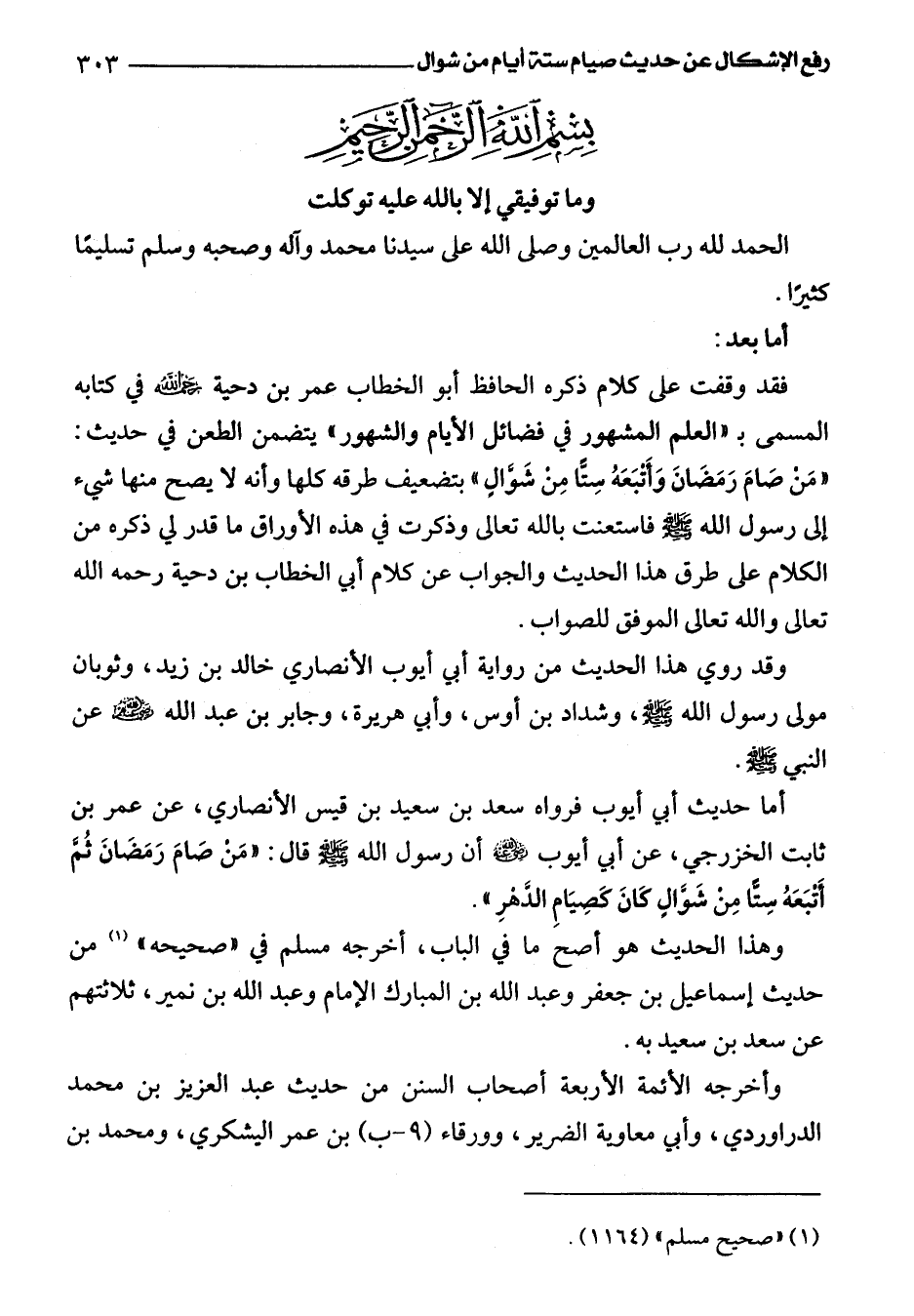 فقد وقفت على كلام ذكره الحافظ أبو الخطاب عمر بن دحية رحمه اللَّه في كتابه المسمى بـ "العلم المشهور في فضائل الأيام والشهور" يتضمن الطعن في حديث: "مَنْ صَامَ رَمَضَانَ وَأَتْبَعَهُ سِتًّا من شَوَّالٍ" بتضعيف طرقه كلها وأنه لا يصح منها شيء إلى رسول اللَّه -صلى اللَّه عليه وسلم- فاستعنت باللَّه تعالى وذكرت في هذه الأوراق ما قدر لي ذكره من الكلام على طرق هذا الحديث والجواب عن كلام أبي الخطاب بن دحية رحمه اللَّه تعالى واللَّه تعالى الموفق للصواب.