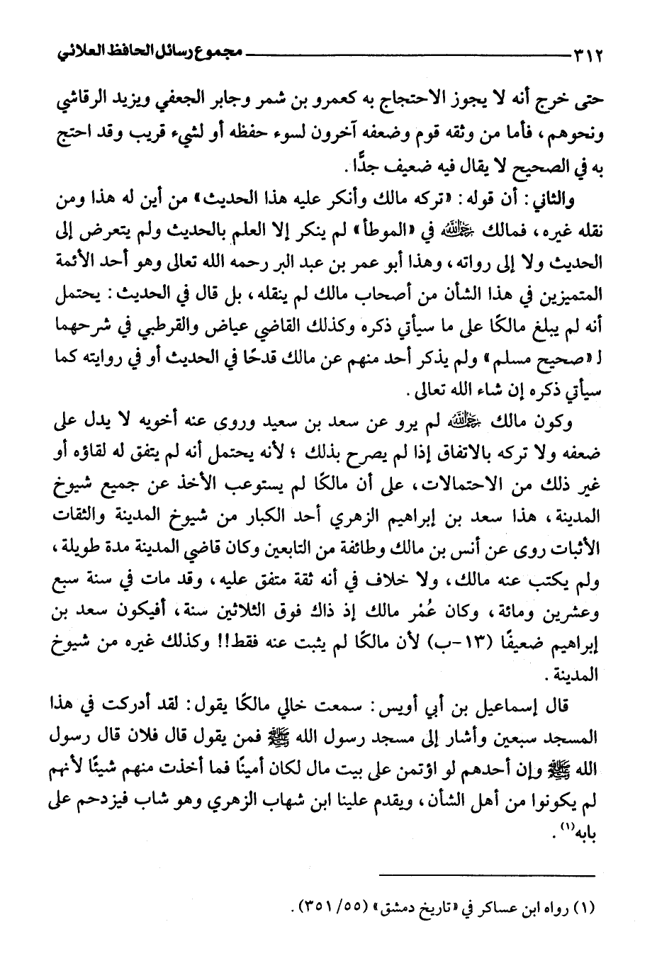 وكون مالك رحمه اللَّه لم يرو عن سعد بن سعيد وروى عنه أخويه لا يدل على ضعفه ولا تركه بالاتفاق إذا لم يصرح بذلك؛ لأنه يحتمل أنه لم يتفق له لقاؤه أو غير ذلك من الاحتمالات، على أن مالكًا لم يستوعب الأخذ عن جميع شيوخ المدينة، هذا سعد بن إبراهيم الزهري أحد الكبار من شيوخ المدينة والثقات الإثبات روى عن أنس بن مالك وطائفة من التابعين وكان قاضي المدينة مدة طويلة، ولم يكتب عنه مالك، ولا خلاف في أنه ثقة متفق عليه، وقد مات في سنة سبع وعشرين ومائة، وكان عُمْر مالك إذ ذاك فوق الثلاثين سنة، أفيكون سعد بن إبراهيم ضعيفًا لأن مالكًا لم يثبت عنه فقط!! وكذلك غيره من شيوخ المدينة.
