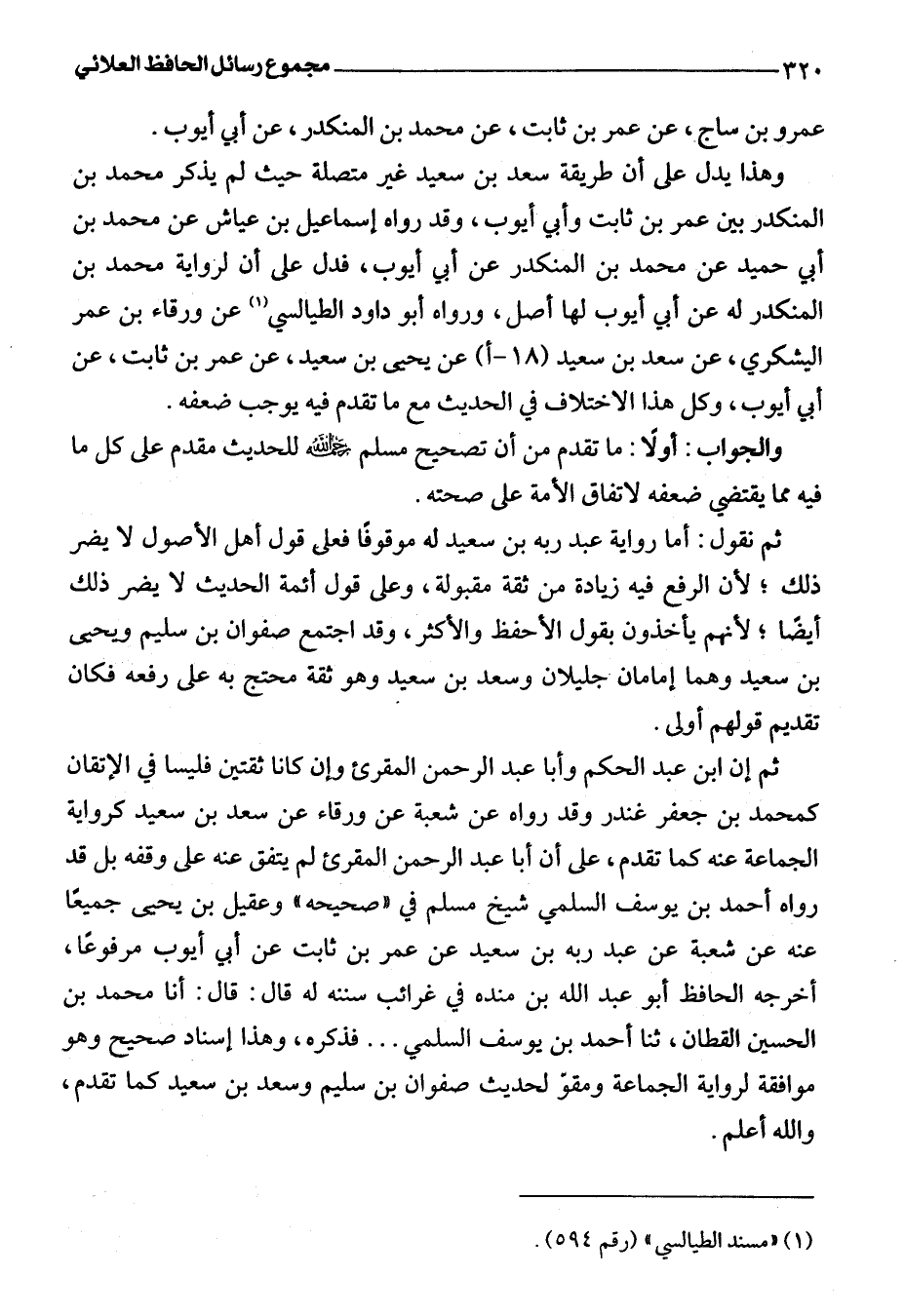 ثم نقول: أما رواية عبد ربه بن سعيد له موقوفًا فعلى قول أهل الأصول لا يضر ذلك؛ لأن الرفع فيه زيادة من ثقة مقبولة، وعلى قول أئمة الحديث لا يضر ذلك أيضًا؛ لأنهم يأخذون بقول الأحفظ والأكثر، وقد اجتمع صفوان بن سليم ويحيى بن سعيد وهما إمامان جليلان وسعد بن سعيد وهو ثقة محتج به على رفعه فكان تقديم قولهم أولى.