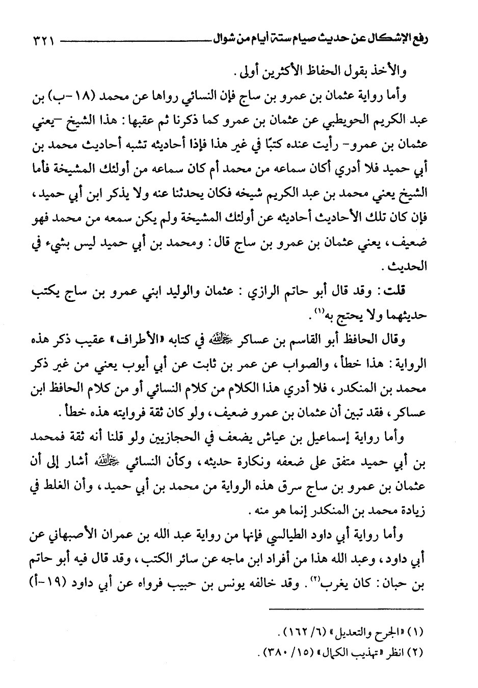 وأما رواية عثمان بن عمرو بن ساج فإن النسائي رواها عن محمد بن عبد الكريم الحويطبي عن عثمان بن عمرو كما ذكرنا ثم عقبها: هذا الشيخ -يعني عثمان بن عمرو- رأيت عنده كتبًا في غير هذا فإذا أحاديثه تشبه أحاديث محمد بن أبي حميد فلا أدري أكان سماعه من محمد أم كان سماعه من أولئك المشيخة فأما الشيح يعني محمد بن عبد الكريم شيخه فكان يحدثنا عنه ولا يذكر ابن أبي حميد، فإن كان تلك الأحاديث أحاديثه عن أولئك المشيخة ولم يكن سمعه من محمد فهو ضعيف، يعني عثمان بن عمرو بن ساج قال: ومحمد بن أبي حميد ليس بشيء في الحديث.