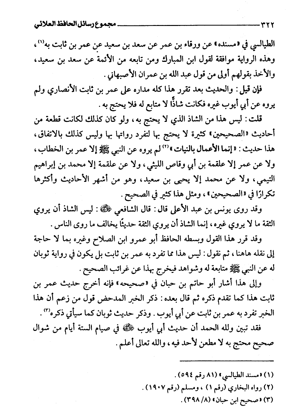 وقد تبين وللَّه الحمد أن حديث أبي أيوب -رضي اللَّه عنه- صيام الستة أيام من شوال صحيح محتج به لا مطعن لأحد فيه، واللَّه تعالى أعلم.