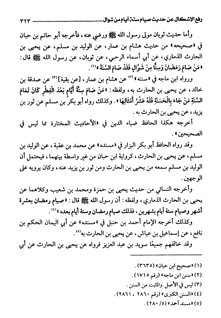 وأما حديث ثوبان مولى رسول اللَّه -صلى اللَّه عليه وسلم- ورضي عنه، فأخرجه أبو حاتم بن حبان في "صحيحه" من حديث هشام بن عمار، عن الوليد بن مسلم، عن يحيى بن الحارث الذماري، عن أبي أسماء الرحبي، عن ثوبان، عن رسول اللَّه -صلى اللَّه عليه وسلم- قال: "مَنْ صَامَ رَمَضَانَ وَسِتًّا مِنْ شَوَّالٍ فَقَدْ صَامَ السَّنَةً" (¬1).