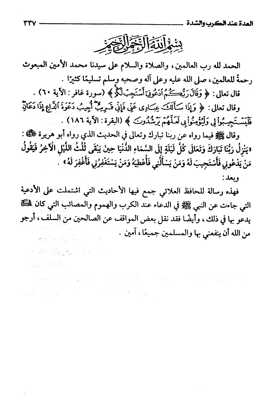 فهذه رسالة للحافظ العلائي جمع فيها الأحاديث التي اشتملت على الأدعية التي جاءت عن النبي -صلى اللَّه عليه وسلم- في الدعاء عند الكرب والهموم والمصائب التي عليه السلام يدعو بها في ذلك، وأيضًا فقد نقل بعض المواقف عن الصالحين من السلف، أرجو من اللَّه أن ينفعني بها والمسلمين جميعًا، آمين.