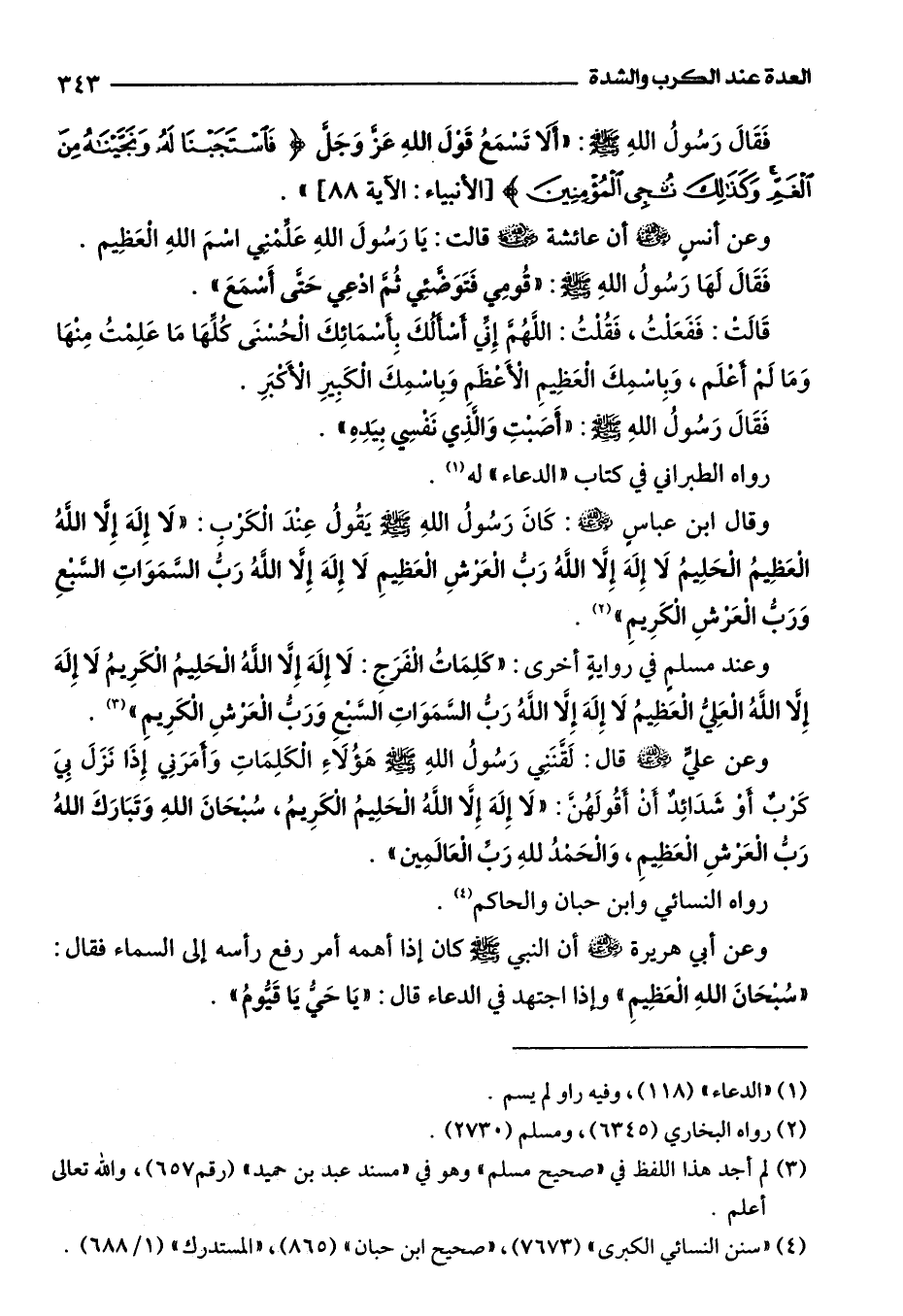 وقال ابن عباس -رضي اللَّه عنه-: كَانَ رَسُولُ اللَّهِ -صلى اللَّه عليه وسلم- يَقُولُ عِنْدَ الْكَرْبِ: "لَا إِلَهَ إِلَّا اللَّهُ الْعَظِيمُ الْحَلِيمُ لَا إِلَهَ إِلَّا اللَّهُ رَبُّ الْعَرْشِ الْعَظِيمِ لَا إِلَهَ إِلَّا اللَّهُ رَبُّ السَّمَوَاتِ السَّبْعِ وَرَبُّ الْعَرْشِ الْكَرِيمِ" (¬2).