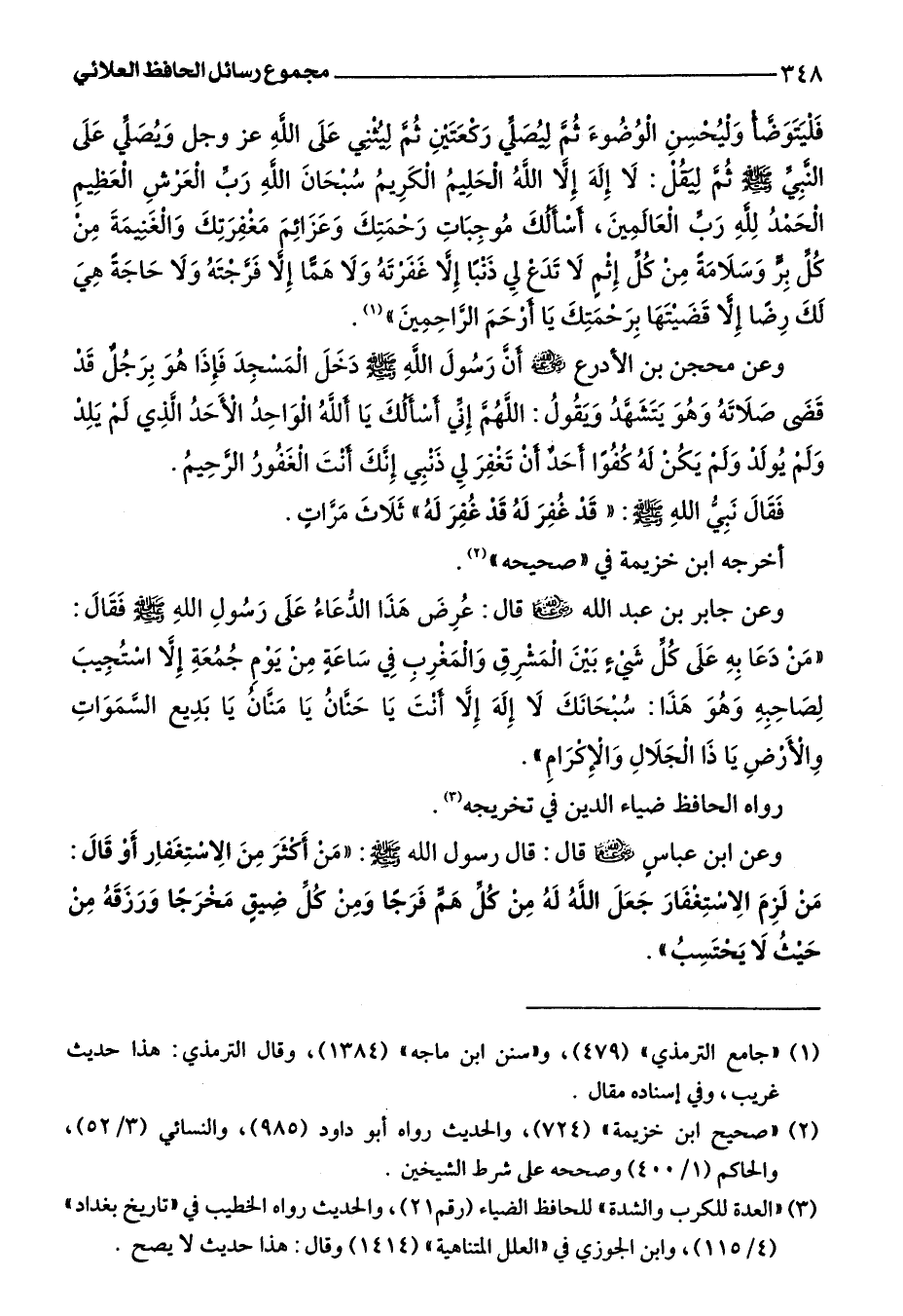 فَلْيَتَوَضَّأْ وَلْيُحْسِنِ الْوُضُوءَ ثُمَّ لِيُصَلِّي رَكْعَتَيْنِ ثُمَّ لِيُثْنِي عَلَى اللَّهِ عَزَّ وَجَلَّ وَيُصَلِّي عَلَى النَّبيِّ -صلى اللَّه عليه وسلم- ثُمَّ لِيَقُلْ: لَا إِلَهَ إِلَّا اللَّهُ الْحَلِيمُ الْكَرِيمُ سُبْحَانَ اللَّهِ رَبِّ الْعَرْشِ الْعَظِيمِ الْحَمْدُ للَّهِ رَبِّ الْعَالمِينَ، أَسْأَلُكَ مُوجِبَاتِ رَحْمَتِكَ وَعَزَائِمَ مَغْفِرَتِكَ وَالْغَنِيمَةَ مِنْ كُلِّ بِرٍّ وَسَلَامَةً مِنْ كُلِّ إِثْمٍ لَا تَدَعَ لِي ذَنْبًا إِلَّا غَفَرْتَهُ وَلَا هَمًّا إِلَّا فَرَّجْتَهُ وَلَا حَاجَةَ هِيَ لَكَ رِضًا إِلَّا قَضَيْتَهَا بِرَحْمَتِكَ يَا أَرْحَمَ الرَّاحِمِينَ" (¬1).