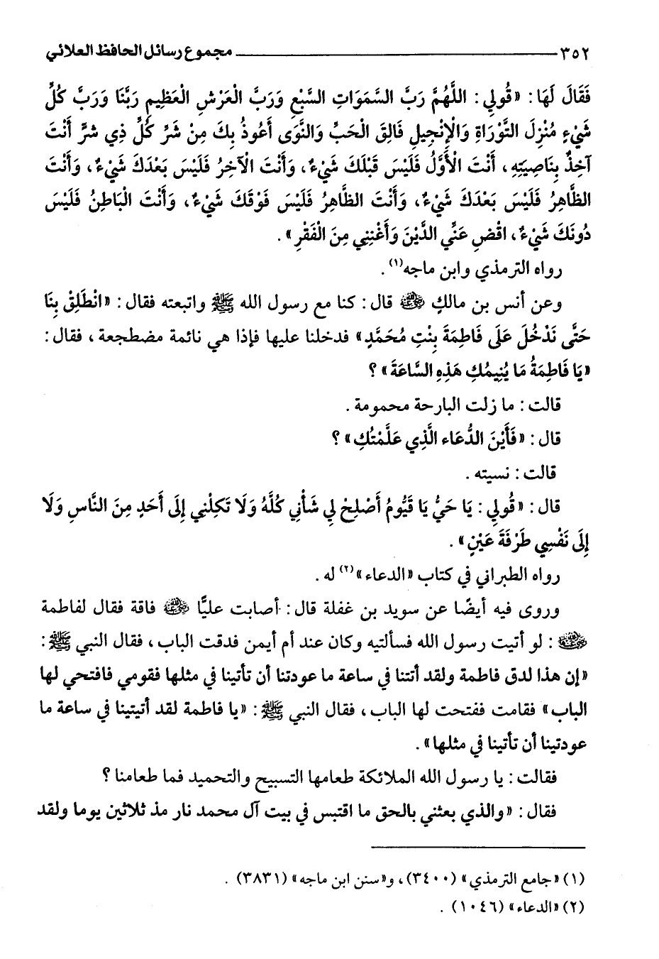 فَقَالَ لَهَا: "قُولِي: اللَّهُمَّ رَبَّ السَّمَوَاتِ السَّبْعِ وَرَبَّ الْعَرْشِ الْعَظِيم رَبَّنَا وَرَبَّ كُلِّ شَيْءٍ مُنْزِلَ التَّوْرَاةِ وَالْإنْجِيلِ فَالِقَ الْحَبِّ وَالنَّوَى أَعُوذُ بِكَ مِنْ شَرِّ كُلِّ ذِي شرٍّ أَنْتَ آخِذٌ بِنَاصِيَتِهِ، أَنْتَ الْأَوَّلُ فَلَيْسَ قَبْلَكَ شَيْءٌ, وَأَنْتَ الْآخِرُ فَلَيْسَ بَعْدَكَ شَيْءٌ، وَأَنْتَ الظَّاهِرُ فَلَيْسَ بَعْدَكَ شَيْءٌ، وَأَنْتَ الظَّاهِرُ فَلَيْسَ فَوْقَكَ شَيْءٌ، وَأَنْتَ الْبَاطِنُ فَلَيْسَ دُونَكَ شَيْءٌ، اقْضِ عَنِّي الدَّيْنَ وَأَغْنِنِي مِنَ الْفَقْرِ".