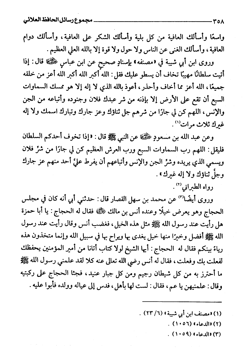 وعن عبد اللَّه بن مسعود -رضي اللَّه عنهما- عن النبي -صلى اللَّه عليه وسلم- قال: "إذا تخوف أحدكم السلطان فليقل: اللهم رب السماوات السبع ورب العرش العظيم كن لي جارًا من شرِّ فلان ويسمي الذي يريده وشرِّ الجن والإنس وأتباعهم أن يفرط عليَّ أحد منهم عز جارك وجلَّ ثناؤك ولا إله غيرك".