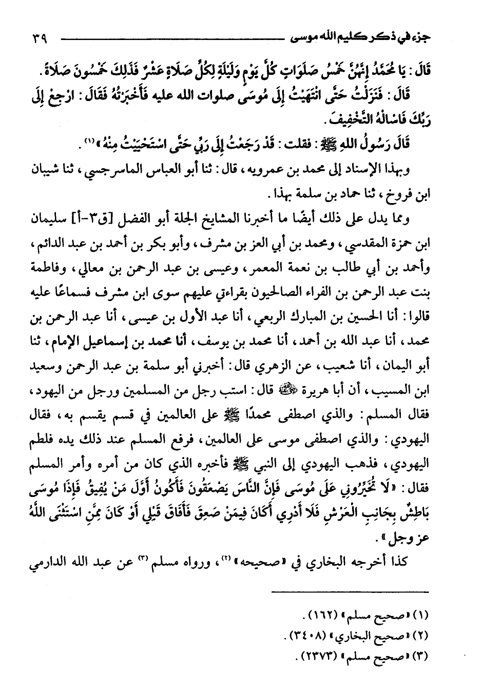 قَالَ: فَنَزَلْتُ حَتَّى انْتَهَيتُ إِلَى مُوسَى صلوات اللَّه عليه فَأَخبَرْتُهُ فَقَالَ: ارْجِعْ إِلَى رَبّكَ فَاسْالْهُ التَّخْفِيفَ.
