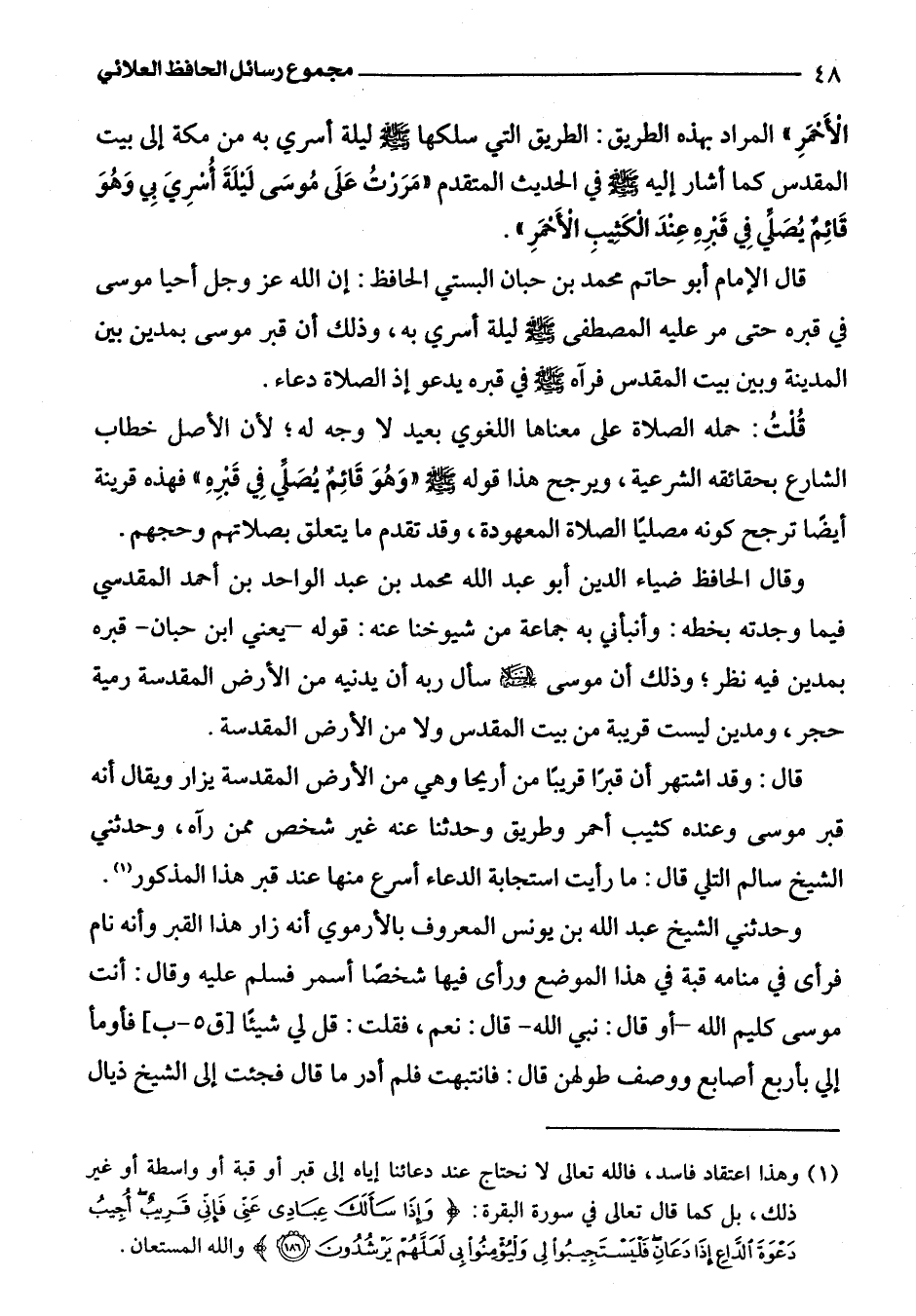 قال الإمام أبو حاتم محمد بن حبان البستي الحافظ: إن اللَّه عز وجل أحيا موسى في قبره حتى مر عليه المصطفى -صلى اللَّه عليه وسلم- ليلة أسري به، وذلك أن قبر موسى بمدين بين المدينة وبين بيت المقدس فرآه -صلى اللَّه عليه وسلم- في قبره يدعو إذ الصلاة دعاء.