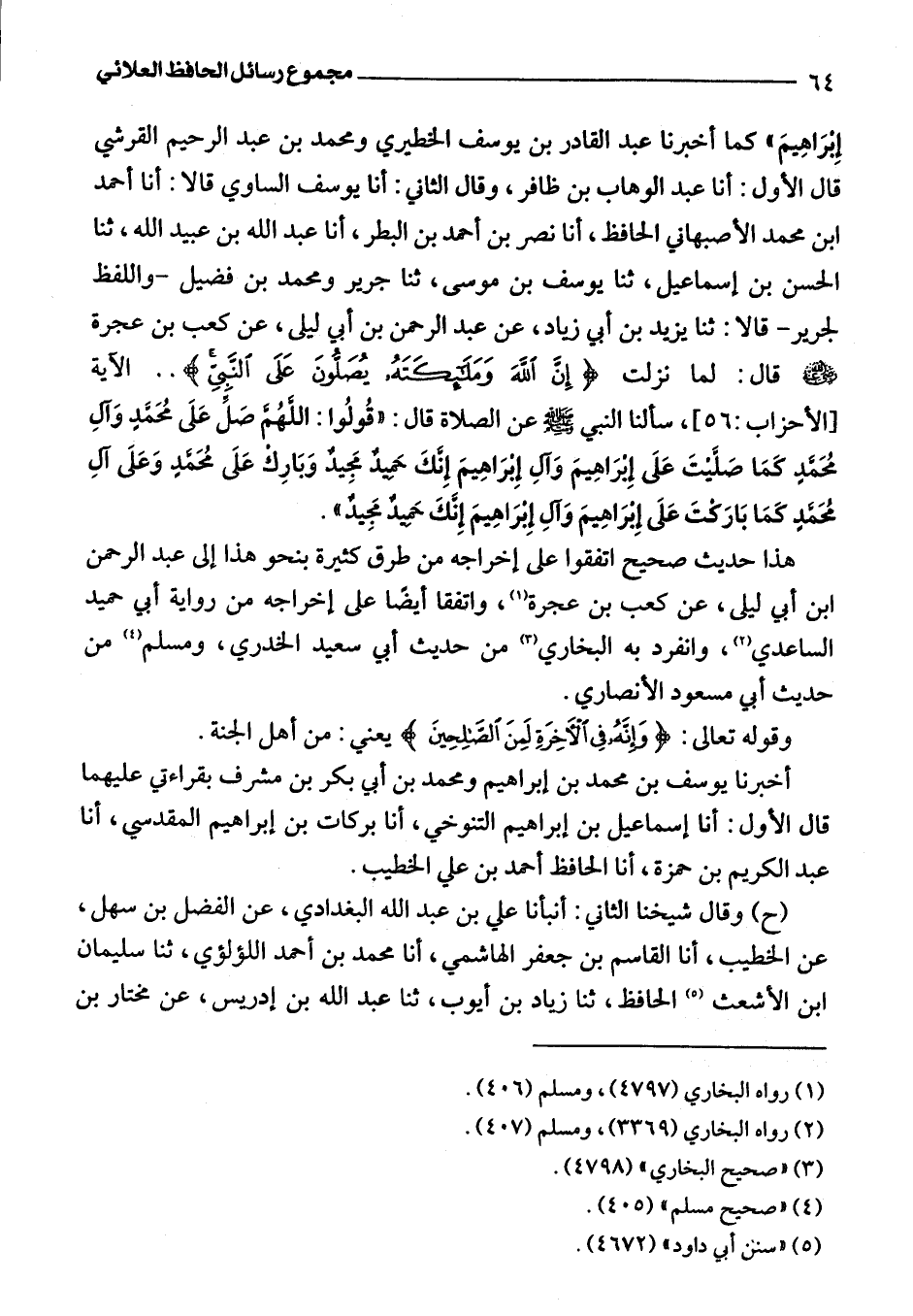 إِبْرَاهِيمَ" كما أخبرنا عبد القادر بن يوسف الخطيري ومحمد بن عبد الرحيم القرشي قال الأول: أنا عبد الوهاب بن ظافر، وقال الثاني: أنا يوسف الساوي قال: أنا أحمد ابن محمد الأصبهاني الحافظ، أنا نصر بن أحمد بن البطر، أنا عبد اللَّه بن عبيد اللَّه، ثنا الحسن بن إسماعيل، ثنا يوسف بن موسى، ثنا جرير ومحمد بن فضيل -واللفظ لجرير- قال: ثنا يزيد بن أبي زياد، عن عبد الرحمن بن أبي ليلى، عن كعب بن عجرة -رضي اللَّه عنه- قال: لما نزلت {إِنَّ اللَّهَ وَمَلَائِكَتَهُ يُصَلُّونَ عَلَى النَّبِيِّ}. . الآية [الأحزاب: 56]، سألنا النبي -صلى اللَّه عليه وسلم- عن الصلاة قال: "قُولُوا: اللَّهُمَّ صَلِّ عَلَى مُحَمَّدٍ وَآلِ مُحَمَّدٍ كَمَا صَلَّيْتَ عَلَى إِبْرَاهِيمَ وَآلِ إِبْرَاهيمَ إِنَّكَ حَمِيدٌ مَجِيدٌ وَبَارِك عَلَى مُحَمَّدٍ وَعَلَى آلِ مُحَمَّدٍ كَمَا بَارَكتَ عَلَى إِبْرَاهِيمَ وَآل إِبْرَاهِيمَ إنَّكَ حَمِيدٌ مَجِيدٌ".