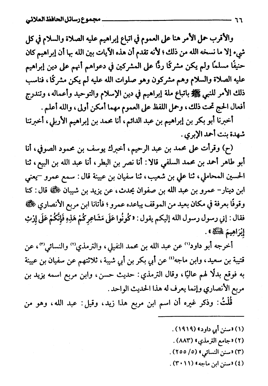(ح) وقرأت على محمد بن عبد الرحيم، أخبرك يوسف بن محمود الصوفي، أنا أبو طاهر أحمد بن محمد السلفي قال: أنا نصر بن البطر، أنا عبد اللَّه بن البيع، ثنا الحسين المحاملي، ثنا علي بن شعيب، ثنا سفيان بن عيينة قال: سمع عمرو يعني ابن دينار -عمرو بن عبد اللَّه بن صفوان يحدث، عن يزيد بن شيبان -رضي اللَّه عنه- قال: كنا وقوفًا بعرفة في مكان بعيد من الموقف يباعده عمرو؛ فأتانا ابن مربع الأنصاري -رضي اللَّه عنه- فقال: إني رسول رسول اللَّه إليكم يقول:"كُونُوا عَلَى مَشَاعِرِكمُ هذهِ فَإِنَّكُمْ عَلَى إِرْثِ إِبْرَاهِيمَ -عليه السلام-".