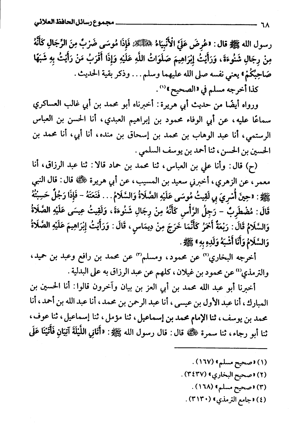 -صلى اللَّه عليه وسلم-:"حِينَ أُسرِيَ بِي لَقِيتُ مُوسَى عَلَيْهِ الصَّلَاةُ وَالسَّلَامُ. . . فَنَعَتَهُ -فَإِذَا رَجُلٌ حَسِبْتُهُ قَالَ: مُضْطَربٌ- رَجِلُ الرَّأْسِ كَأَنَّهُ مِنْ رِجَالِ شَنُوءَةَ، وَلَقِيتُ عِيسَى عَلَيْهِ الصَّلَاةُ وَالسَّلَامُ قَالَ: رَبْعَةٌ أَحْمَرُ كَأَنَّمَا خَرَجَ مِنْ دِيمَاسٍ، قَالَ: وَرَأَيْتُ إِبْرَاهِيمَ عَلَيْهِ الصَّلَاةُ وَالسَّلَامُ وَأَنَا أَشْبَهُ وَلَدِهِ بِهِ".