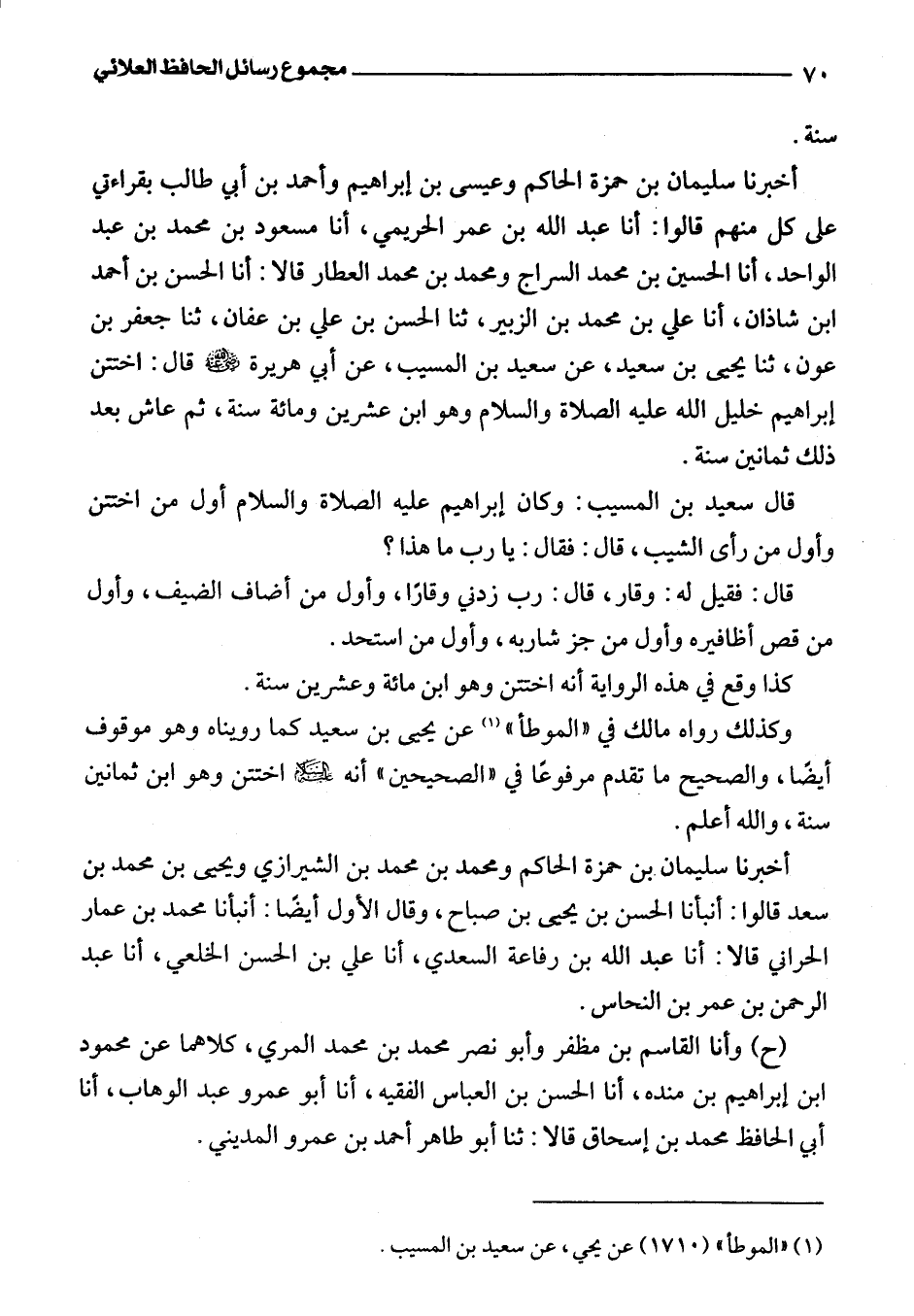 أخبرنا سليمان بن حمزة الحاكم وعيسى بن إبراهيم وأحمد بن أبي طالب بقراءتي على كل منهم قالوا: أنا عبد اللَّه بن عمر الحريمي، أنا مسعود بن محمد بن عبد الواحد، أنا الحسين بن محمد السراج ومحمد بن محمد العطار قالا: أنا الحسن بن أحمد ابن شاذان، أنا علي بن محمد بن الزبير، ثنا الحسن بن علي بن عفان، ثنا جعفر بن عون، ثنا يحيى بن سعيد، عن سعيد بن المسيب، عن أبي هريرة -رضي اللَّه عنه- قال: اختتن إبراهيم خليل اللَّه عليه الصلاة والسلام وهو ابن عشرين ومائة سنة، ثم عاش بعد ذلك ثمانين سنة.