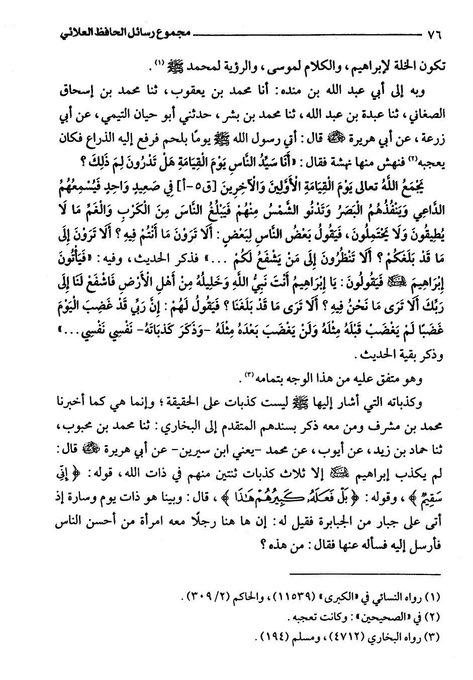 يَجْمَعُ اللَّهُ تعالى يَوْمَ الْقِيَامَةِ الأَوَّلينَ وَالآخِرِينَ فِي صَعِيدٍ وَاحِدٍ فَيُسْمِعُهُمُ الدَّاعِي وَيَنْفُذُهُمُ الْبَصَرُ وَتَدْنُو الشَّمْسُ مِنْهُمْ فَيَبْلُغُ النَّاسَ مِنَ الْكَرْبِ والْغَمِّ مَا لَا يُطِيقُونَ وَلَا يَحْتَمِلُونَ، فَيَقُولُ بَعْضُ النَّاسِ لِبَعْضٍ: ألَا تَرَوْنَ مَا أَنْتُمْ فِيهِ؟ أَلَا تَرَوْنَ إِلَى مَا قَدْ بَلَغَكُمْ؟ أَلَا تَنْظُرُونَ إِلَى مَنْ يَشْفَعُ لَكُمْ. . . " فذكر الحديث، وفيه: "فَيَأْتُونَ إِبْرَاهِيمَ -عليه السلام- فَيَقُولُونَ: يَا إِبْرَاهِيمُ أَنْتَ نَبِيُّ اللَّهِ وَخَلِيلُهُ مِنْ أَهْلِ الأَرْضِ فَاشْفَعْ لَنَا إِلَى رَبِّكَ أَلَا تَرَى مَا نَحْنُ فِيهِ؟ أَلَا تَرَى مَا قَدْ بَلَغَنَا؟ فَيَقُولُ لَهُمْ: إِنَّ رَبِّي قَدْ غَضِبَ الْيَوْمَ غَضَبًا لَمْ يَغْضَبْ قَبْلَهُ مِثْلَهُ وَلَنْ يَغْضَبَ بَعْدَهُ مِثْلَهُ -وَذَكَرَ كَذبَاتَهُ- نَفْسِي نَفْسِي. . . " وذكر بقية الحديث.