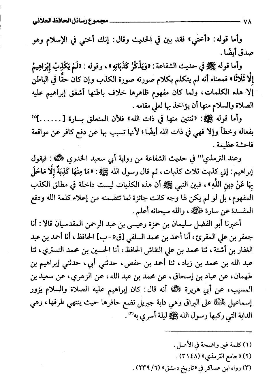 وأما قوله -صلى اللَّه عليه وسلم-: "ثنتين منها في ذات اللَّه" فلأن المتعلق بسارة [. . .] (¬1) بفعاله وخطأ وإلا فهي في ذات اللَّه أيضًا؛ لأنها تسبب بها عن دفع كافر عن مواقعة فاحشة عظيمة.