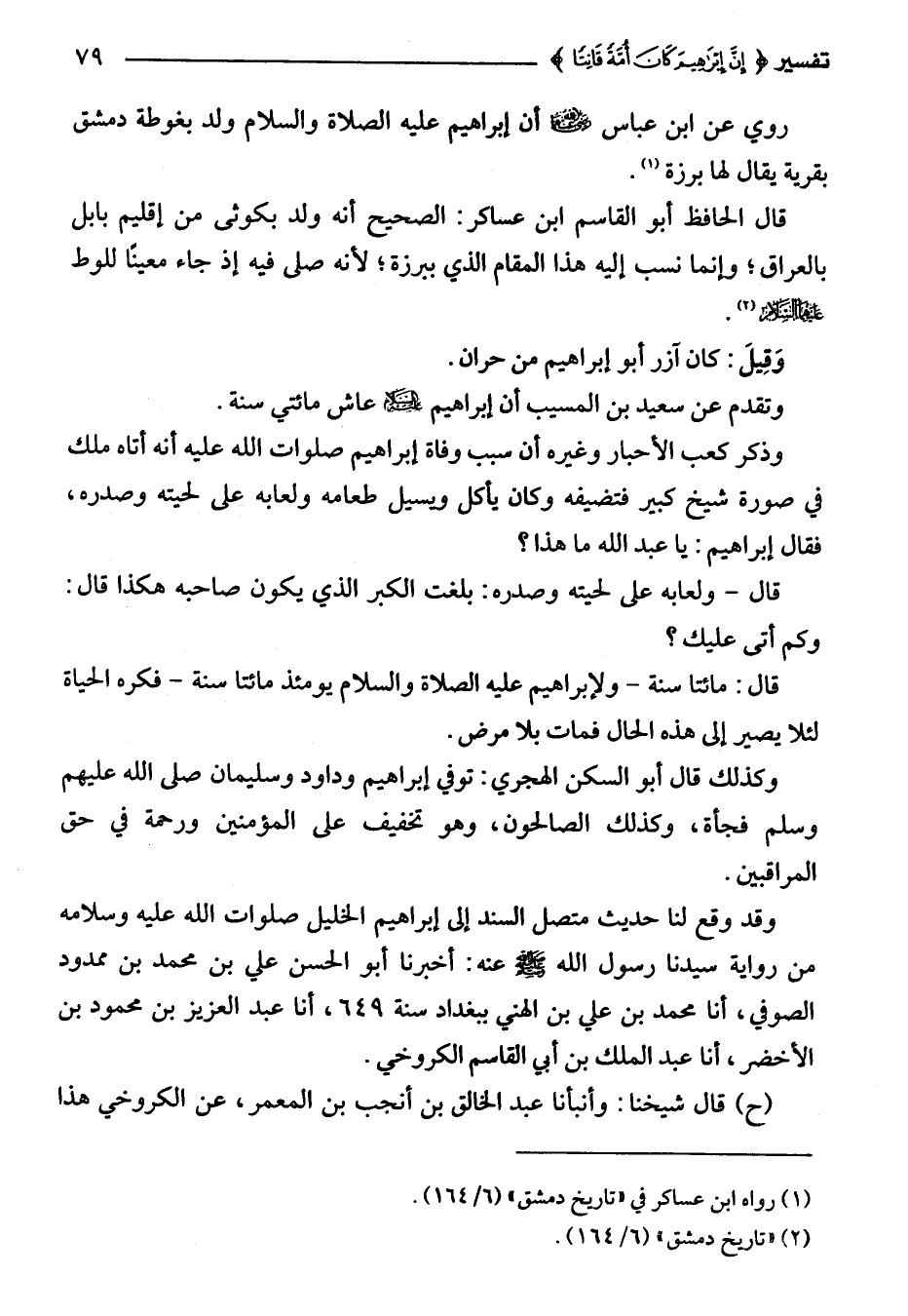 قال الحافظ أبو القاسم ابن عساكر: الصحيح أنه ولد بكوثى من إقليم بابل بالعراق؛ وإنما نسب إليه هذا المقام الذي ببرزة؛ لأنه صلى فيه إذ جاء معينًا للوط -عليه السلام- (¬2).