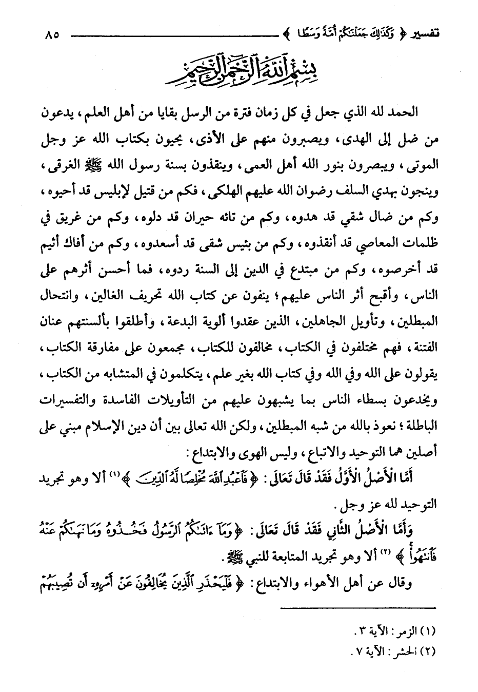 الحمد للَّه الذي جعل في كل زمان فترة من الرسل بقايا من أهل العلم، يدعون من ضل إلى الهدى، ويصبرون منهم على الأذى، يحيون بكتاب اللَّه عز وجل الموتى، ويبصرون بنور اللَّه أهل العمى، وينقذون بسنة رسول اللَّه -صلى اللَّه عليه وسلم- الغرقى، وينجون بهدي السلف رضوان اللَّه عليهم الهلكلى، فكم من قتيل لإبليس قد أحيوه، وكم من ضال شقي قد هدوه، وكم من تائه حيران قد دلوه، وكم من غريق في ظلمات المعاصي قد أنقذوه، وكم من بئيس شقى قد أسعدوه، وكم من أفاك أثيم قد أخرصوه، وكم من مبتدع في الدين إلى السنة ردوه، فما أحسن أثرهم على الناس، وأقبح أثر الناس عليهم؛ ينفون عن كتاب اللَّه تحريف الغالين، وانتحال المبطلين، وتأويل الجاهلين، الذين عقدوا ألوية البدعة، وأطلقوا بألسنتهم عنان الفتنة، فهم مختلفون في الكتاب، مخالفون للكتاب، مجمعون على مفارقة الكتاب، يقولون على اللَّه وفي اللَّه وفي كتاب اللَّه بغير علم، يتكلمون في المتشابه من الكتاب، ويخدعون بسطاء الناس بما يشبهون عليهم من التأويلات الفاسدة والتفسيرات الباطلة؛ نعوذ باللَّه من شبه المبطلين، ولكن اللَّه تعالى بين أن دين الإسلام مبني على أصلين هما التوحيد والاتباع، وليس الهوى والابتداع: