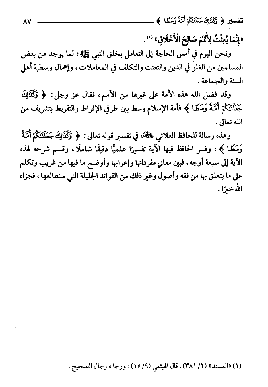 وهذه رسالة للحافظ العلائي -رحمه اللَّه- في تفسير قوله تعالى: {وَكَذَلِكَ جَعَلْنَاكُمْ أُمَّةً وَسَطًا}، وفسر الحافظ فيها الآية تفسيرًا علميًّا دقيقًا شاملًا، وقسم شرحه لهذه الآية إلى سبعة أوجه، فبين معاني مفرداتها وإعرابها وأوضح ما فيها من غريب وتكلم على ما يتعلق بها من فقه وأصول وغير ذلك من الفوائد الجليلة التي سنطالعها، فجزاه اللَّه خيرًا.