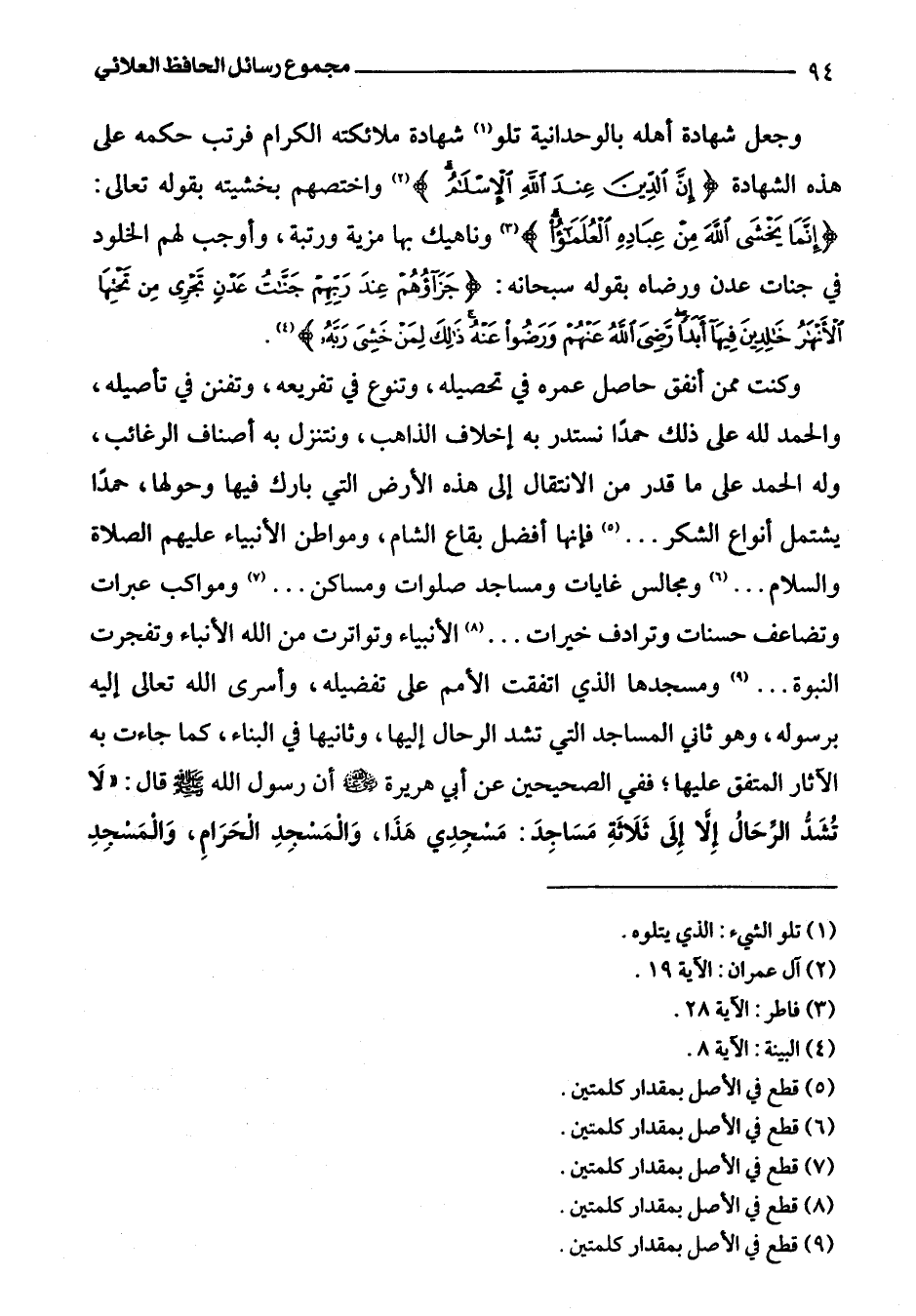 وكنت ممن أنفق حاصل عمره في تحصيله، وتنوع في تفريعه، وتفنن في تأصيله، والحمد للَّه على ذلك حمدًا نستدر به إخلاف المذاهب، ونتنزل به أصناف الرغائب، وله الحمد على ما قدر من الانتقال إلى هذه الأرض التي بارك فيها وحولها، حمدًا يشتمل أنواع الشكر. . . (¬5) فإنها أفضل بقاع الشام، ومواطن الأنبياء عليهم الصلاة والسلام. . . (¬6) ومجالس غايات ومساجد صلوات ومساكن. . . (¬7) ومواكب عبرات وتضاعف حسنات وترادف خيرات. . . (¬8) الأنبياء وتواترت من اللَّه الأنباء وتفجرت النبوة. . . (¬9) ومسجدها الذي اتفقت الأمم على تفضيله، وأسرى اللَّه تعالى إليه برسوله، وهو ثاني المساجد التي تشد الرحال إليها، وثانيها في البناء، كما جاءت به الآثار المتفق عليها؛ ففي الصحيحين عن أبي هريرة -رضي اللَّه عنه- أن رسول اللَّه -صلى اللَّه عليه وسلم- قال: "لَا تُشَدُّ الرِّحَالُ إِلَّا إِلَى ثَلَاثَةِ مَسَاجِدَ: مَسْجِدِي هَذَا، وَالْمَسْجِدِ الْحَرَامِ، والْمَسْجِدِ