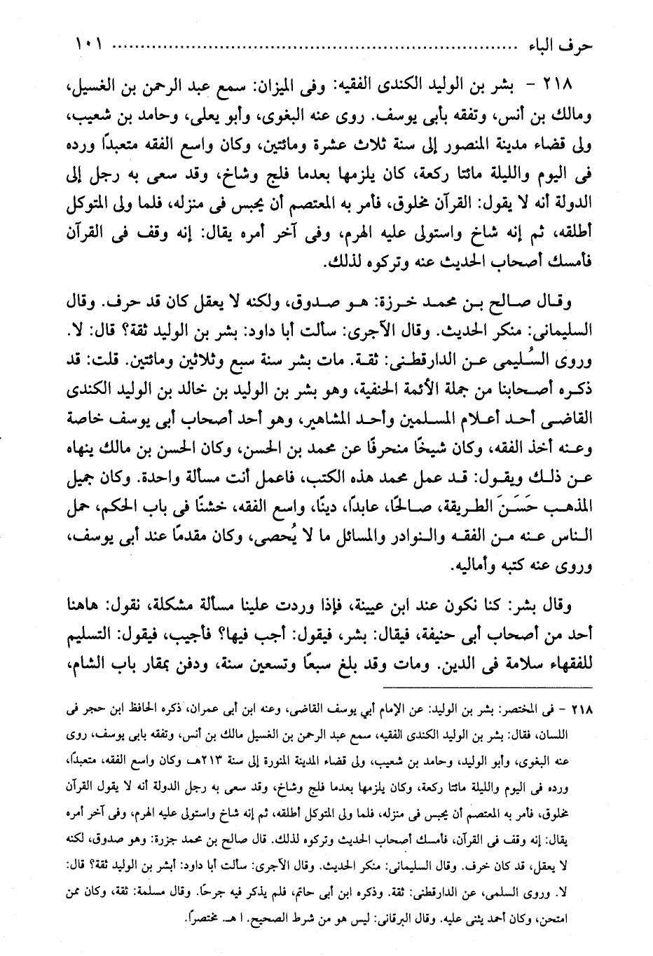 218 - بشر بن الوليد الكندى الفقيه: وفى الميزان: سمع عبد الرحمن بن الغسيل، ومالك بن أنس، وتفقه بأبى يوسف. روى عنه البغوى، وأبو يعلى، وحامد بن شعيب، ولى قضاء مدينة المنصور إلى سنة ثلاث عشرة ومائتين، وكان واسع الفقه متعبدًا ورده فى اليوم والليلة مائتا ركعة، كان يلزمها بعدما فلج وشاخ، وقد سعى به رجل إلى الدولة أنه لا يقول: القرآن مخلوق، فأمر به المعتصم أن يحبس فى منزله، فلما ولى المتوكل أطلقه، ثم إنه شاخ واستولى عليه الهرم، وفى آخر أمره يقال: إنه وقف فى القرآن فأمسك أصحاب الحديث عنه وتركوه لذلك.