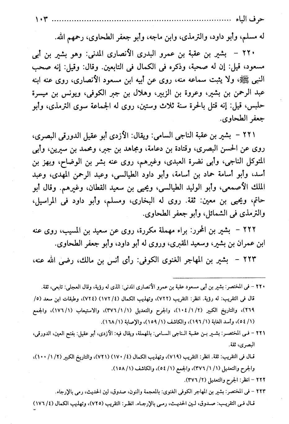 221 - بشير بن عقبة الناجى السامى: ويقال: الأزدى أبو عقيل الدورقى البصرى، روى عن الحسن البصرى، وقتادة بن دعامة، ومجاهد بن جبر، ومحمد بن سيرين، وأبى المتوكل الناجى، وأبى نضرة العبدى، وغيرهم، روى عنه بشر بن الوضاح، وبهز بن أسد، وأبو أسامة حماد بن أسامة، وأبو داود الطيالسى، وعبد الرحمن المهدى، وعبد الملك الأصمعى، وأبو الوليد الطيالسى، ويحيى بن سعيد القطان، وغيرهم. وقال أبو حاتم، ويحيى بن معين: ثقة. روى له البخارى، ومسلم، وأبو داود فى المراسيل، والترمذى فى الشمائل، وأبو جعفر الطحاوى.