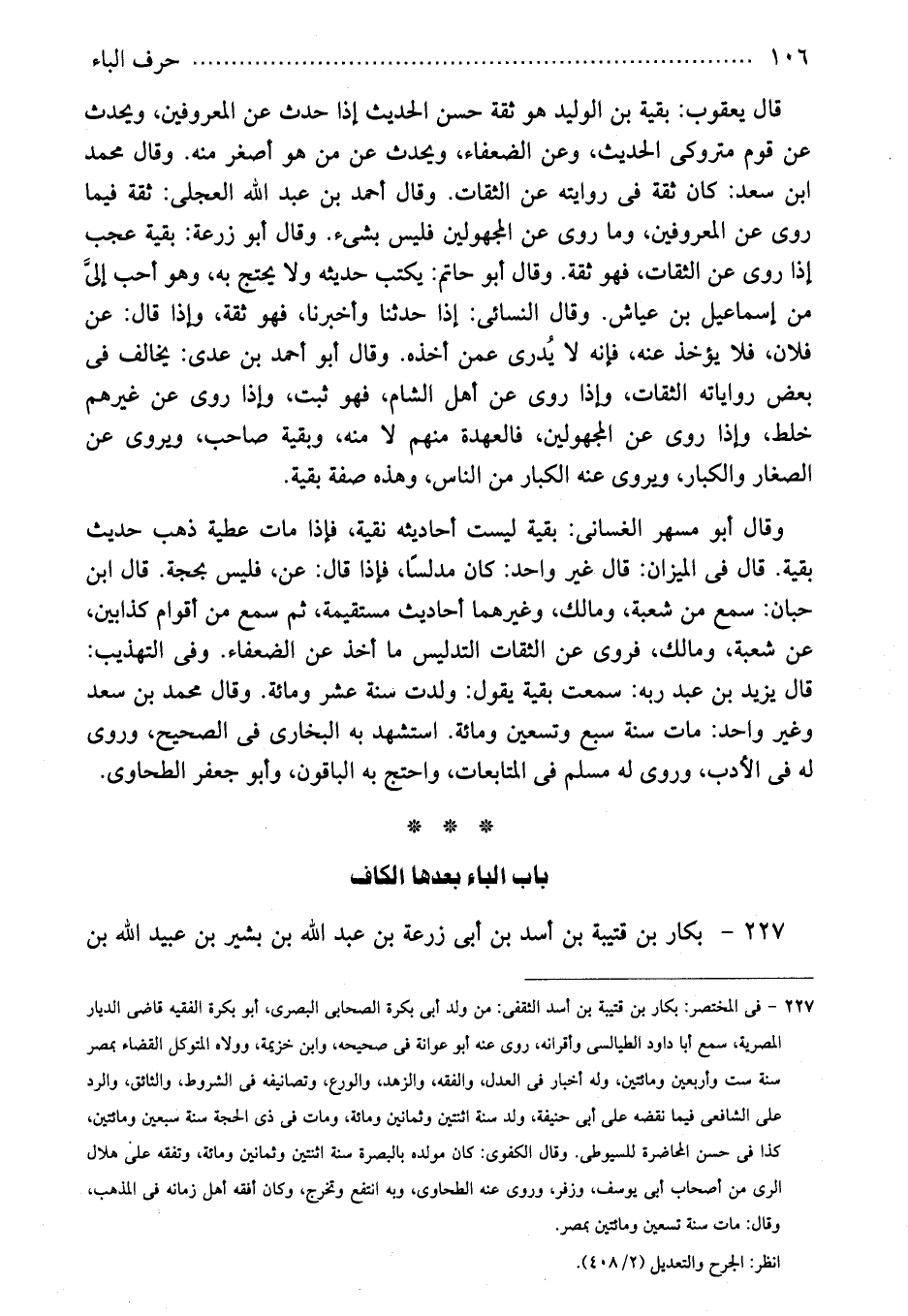 وقال أبو مسهر الغسانى: بقية ليست أحاديثه نقية، فإذا مات عطية ذهب حديث بقية. قال فى الميزان: قال غير واحد: كان مدلسًا، فإذا قال: عن، فليس بحجة. قال ابن حبان: سمع من شعبة، ومالك، وغيرهما أحاديث مستقيمة، ثم سمع من أقوام كذابين، عن شعبة، ومالك، فروى عن الثقات التدليس ما أخذ عن الضعفاء. وفى التهذيب: قال يزيد بن عبد ربه: سمعت بقية يقول: ولدت سنة عشر ومائة. وقال محمد بن سعد وغير واحد: مات سنة سبع وتسعين ومائة. استشهد به البخارى فى الصحيح، وروى له فى الأدب، وروى له مسلم فى المتابعات، واحتج به الباقون، وأبو جعفر الطحاوى.