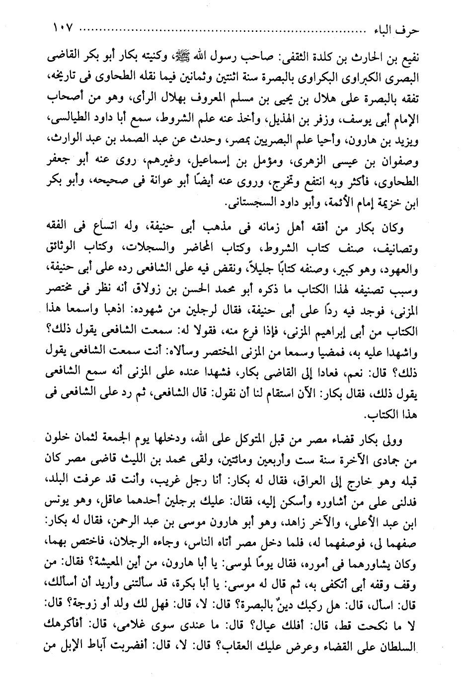 بن نفيع بن الحارث بن كلدة الثقفى: صاحب رسول الله - صلى الله عليه وسلم -، وكنيته بكار أبو بكر القاضى البصرى الكبراوى البكراوى بالبصرة سنة اثنتين وثمانين فيما نقله الطحاوى فى تاريخه، تفقه بالبصرة على هلال بن يحيى بن مسلم المعروف بهلال الرأى، وهو من أصحاب الإمام أبى يوسف، وزفر بن الهذيل، وأخذ عنه علم الشروط، سمع أبا داود الطيالسى، ويزيد بن هارون، وأحيا علم البصريين بمصر، وحدث عن عبد الصمد بن عبد الوارث، وصفوان بن عيسى الزهرى، ومؤمل بن إسماعيل، وغيرهم، روى عنه أبو جعفر الطحاوى، فأكثر وبه انتفع وتخرج، وروى عنه أيضًا أبو عوانة فى صحيحه، وأبو بكر ابن خزيمة إمام الأئمة، وأبو داود السجستانى.