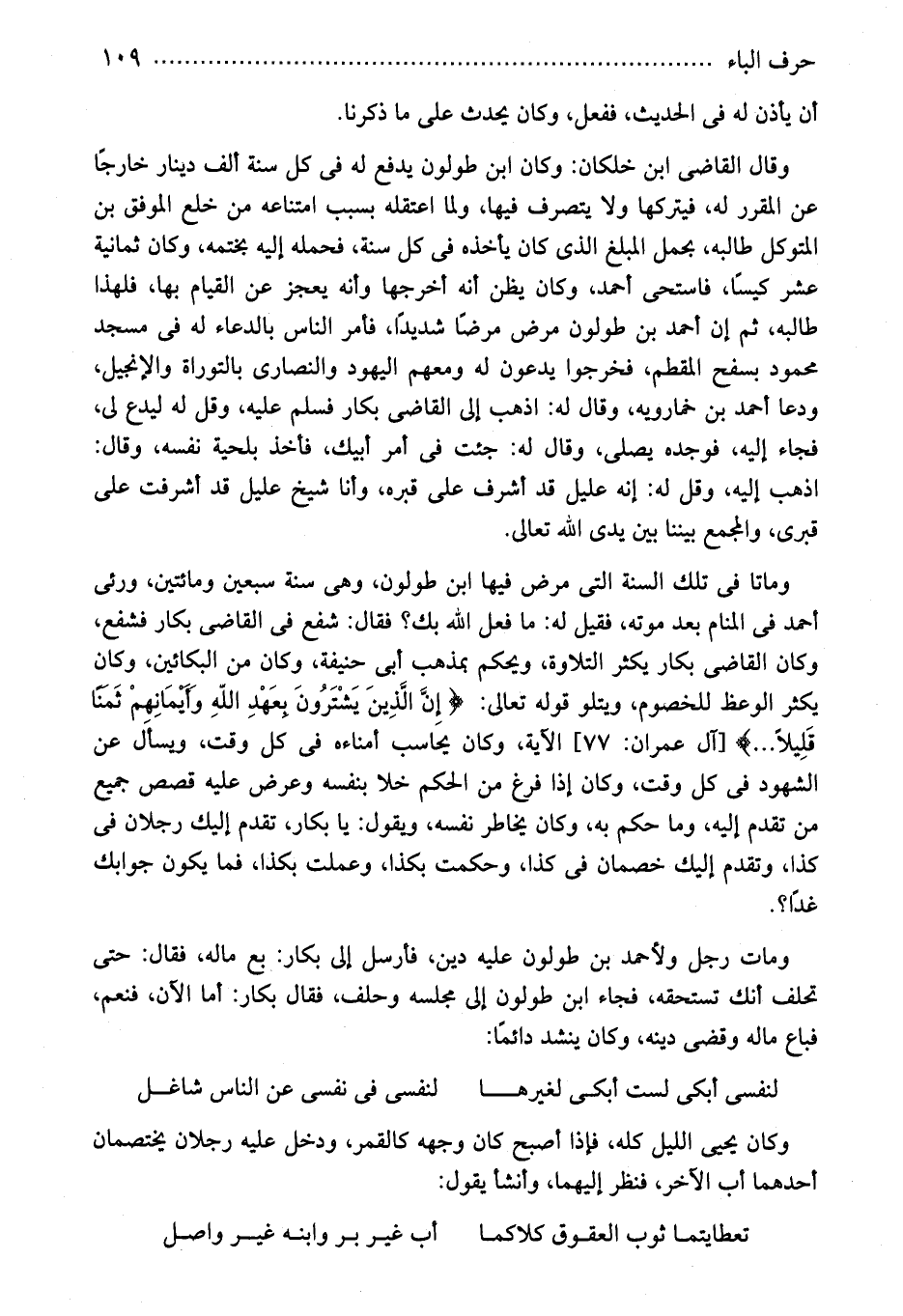 وماتا فى تلك السنة التى مرض فيها ابن طولون، وهى سنة سبعين ومائتين، ورئى أحمد فى المنام بعد موته، فقيل له: ما فعل الله بك؟ فقال: شفع فى القاضى بكار فشفع، وكان القاضى بكار يكثر التلاوة، ويحكم بمذهب أبى حنيفة، وكان من البكائين، وكان يكثر الوعظ للخصوم، ويتلو قوله تعالى: {إِنَّ الَّذِينَ يَشْتَرُونَ بِعَهْدِ اللهِ وَأَيْمَانِهِمْ ثَمَنًا قَلِيلاً ... } [آل عمران: 77] الآية، وكان يحاسب أمناءه فى كل وقت، ويسأل عن الشهود فى كل وقت، وكان إذا فرغ من الحكم خلا بنفسه وعرض عليه قصص جميع من تقدم إليه، وما حكم به، وكان يخاطر نفسه، ويقول: يا بكار، تقدم إليك رجلان فى كذا، وتقدم إليك خصمان فى كذا، وحكمت بكذا، وعملت بكذا، فما يكون جوابك غدًا؟.