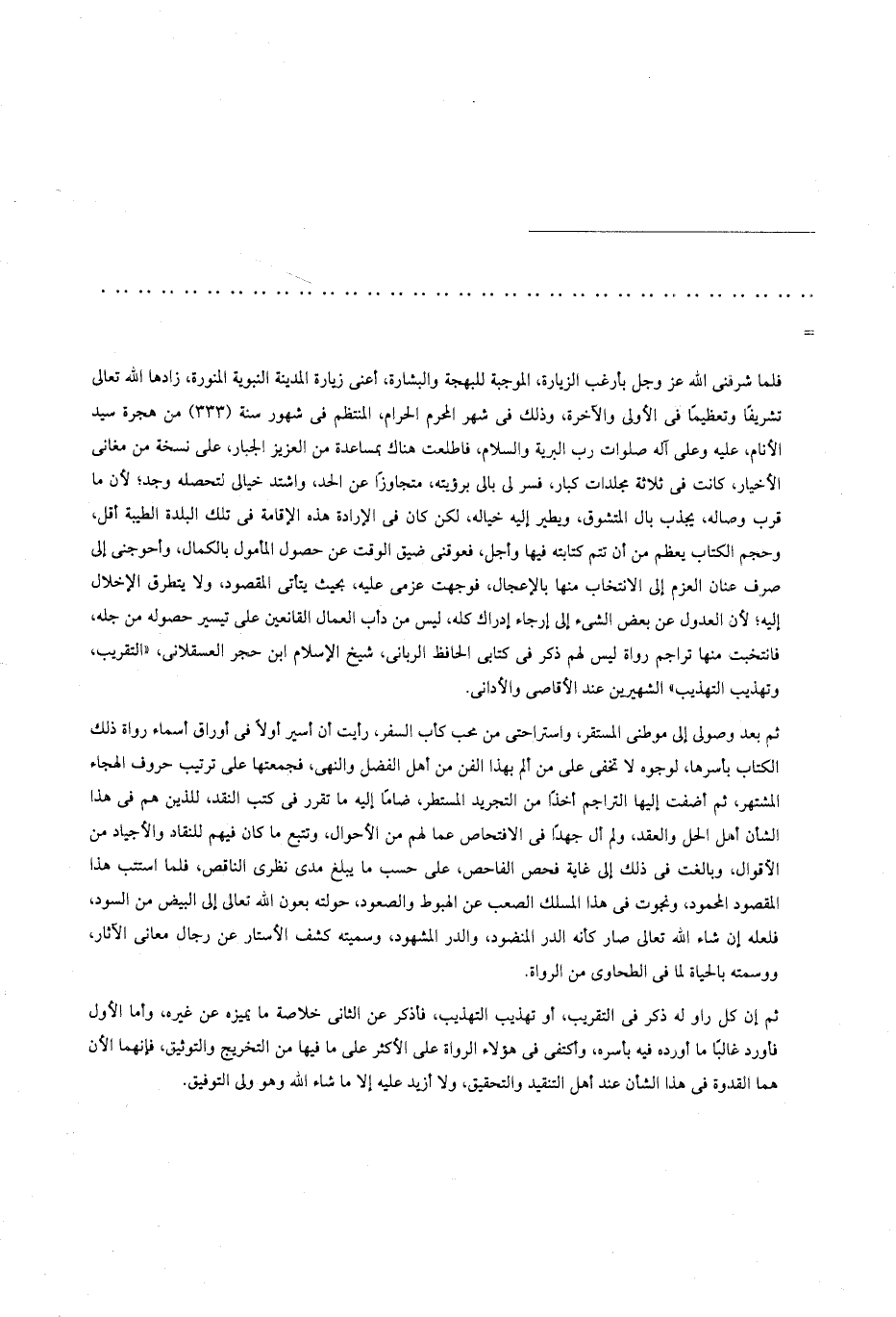 =فلما شرفنى الله عز وجل بأرغب الزيارة، الموجبة للبهجة والبشارة، أعنى زيارة المدينة النبوية المنورة، زادها الله تعالى تشريفًا وتعظيمًا فى الأولى والآخرة، وذلك فى شهر المحرم الحرام، المنتظم فى شهور سنة (333) من هجرة سيد الأنام، عليه وعلى آله صلوات رب البرية والسلام، فاطلعت هناك بمساعدة من العزيز الجبار، على نسخة من مغانى الأخيار، كانت فى ثلاثة مجلدات كبار، فسر لى بالى برؤيته، متجاوزًا عن الحد، واشتد خيالى لتحصله وجد؛ لأن ما قرب وصاله، يجذب بال المتشوق، ويطير إليه خياله، لكن كان فى الإرادة هذه الإقامة فى تلك البلدة الطيبة أقل، وحجم الكتاب يعظم من أن تتم كتابته فيها وأجل، فعوقنى ضيق الوقت عن حصول المأمول بالكمال، وأحوجنى إلى صرف عنان العزم إلى الانتخاب منها بالإعجال، فوجهت عزمى عليه، بحيث يتأتى المقصود، ولا يتطرق الإخلال إليه؛ لأن العدول عن بعض الشىء إلى إرجاء إدراك كله، ليس من دأب العمال القانعين على تيسير حصوله من جله، فانتخبت منها تراجم رواة ليس لهم ذكر فى كتابى الحافظ الربانى، شيخ الإسلام ابن حجر العسقلانى، "التقريب، وتهذيب التهذيب" الشهيرين عند الأقاصى والأدانى.