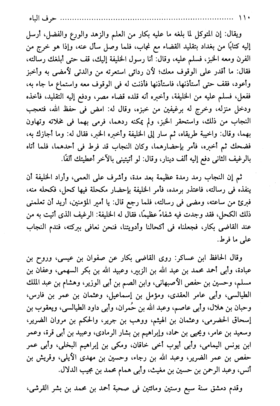وقال الحافظ ابن عساكر: روى القاضى بكار عن صفوان بن عيسى، وروح بن عبادة، وأبى أحمد محمد بن عبد الله بن الزبير، وعبيد الله بن بكر السهمى، وعفان بن مسلم، وحسين بن حفص الأصبهانى، وابن الصم بن أبى الوزير، وهشام بن عبد الملك الطيالسى، وأبى عامر العقدى، ومؤمل بن إسماعيل، وعثمان بن عمر بن فارس، وحبان بن هلال، وأبى عاصم، وعبد الله بن حُمران، وأبى داود الطيالسى، ويعقوب بن إسحاق الحضرمى، وعثمان بن الهيثم، ووهب بن جرير، والحكم بن مروان الضرير، وسعيد بن عامر، ويحيى بن حماد، وإبراهيم بن بشار الرمادى، وعبيد بن أبى قرة، وعمر ابن يونس اليمامى، وأبى أيوب أخى خاقان، ومكى بن إبراهيم البخلى، وأبى عمر حفص بن عمر الضرير، وعبد الله بن رجاء، وحسين بن مهدى الأيلى، وقريش بن أنس، وعبد الرحمن بن حسين بن مغيث، وأبى همام محمد بن مجيب الدلال.