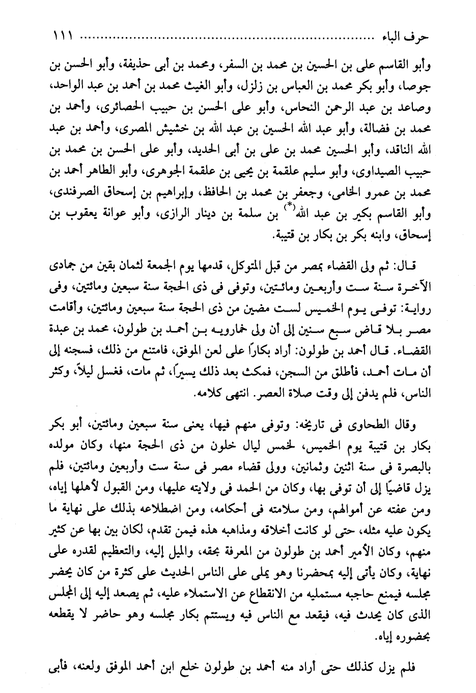 وقال الطحاوى فى تاريخه: وتوفى منهم فيها، يعنى سنة سبعين ومائتين، أبو بكر بكار بن قتيبة يوم الخميس، لخمس ليال خلون من ذى الحجة منها، وكان مولده بالبصرة فى سنة اثنين وثمانين، وولى قضاء مصر فى سنة ست وأربعين ومائتين، فلم يزل قاضيًا إلى أن توفى بها، وكان من الحمد فى ولايته عليها، ومن القبول لأهلها إياه، ومن عفته عن أموالهم، ومن سلامته فى أحكامه، ومن اضطلاعه بذلك على نهاية ما يكون عليه مثله، حتى لو كانت أخلاقه ومذاهبه هذه فيمن تقدم، لكان بين بها عن كثير منهم، وكان الأمير أحمد بن طولون من المعرفة بحقه، والميل إليه، والتعظيم لقدره على نهاية، وكان يأتى إليه بمحضرنا وهو يملى على الناس الحديث على كثرة من كان يحضر مجلسه فيمنع حاجبه مستمليه من الانقطاع عن الاستملاء عليه، ثم يصعد إليه إلى المجلس الذى كان يحدث فيه، فيقعد مع الناس فيه ويستتم بكار مجلسه وهو حاضر لا يقطعه بحضوره إياه.