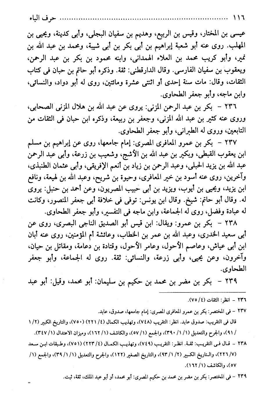 237 - بكر بن عمرو المعافرى المصرى: إمام جامعها، روى عن إبراهيم بن مسلم ابن يعقوب القبطى، وبكير بن عبد الله بن الأشج، وشعيب بن زرعة، وأبى عبد الرحمن عبد الله بن يزيد الحبلى، وعبد الرحمن بن زياد بن أنعم الإفريقى، وأبى عثمان الطنبذى، وآخرين، روى عنه أسود بن خير المعافرى، وحيوة بن شريح، وعبد الله بن لهيعة، ونافع ابن يزيد، ويحيى بن أيوب، ويزيد بن أبى حبيب المصريون، وعن أحمد بن حنبل: يروى له. وقال أبو حاتم: شيخ. وقال ابن يونس: توفى فى خلافة أبى جعفر المنصور، وكانت له عبادة وفضل، روى له الجماعة، وابن ماجه فى التفسير، وأبو جعفر الطحاوى.