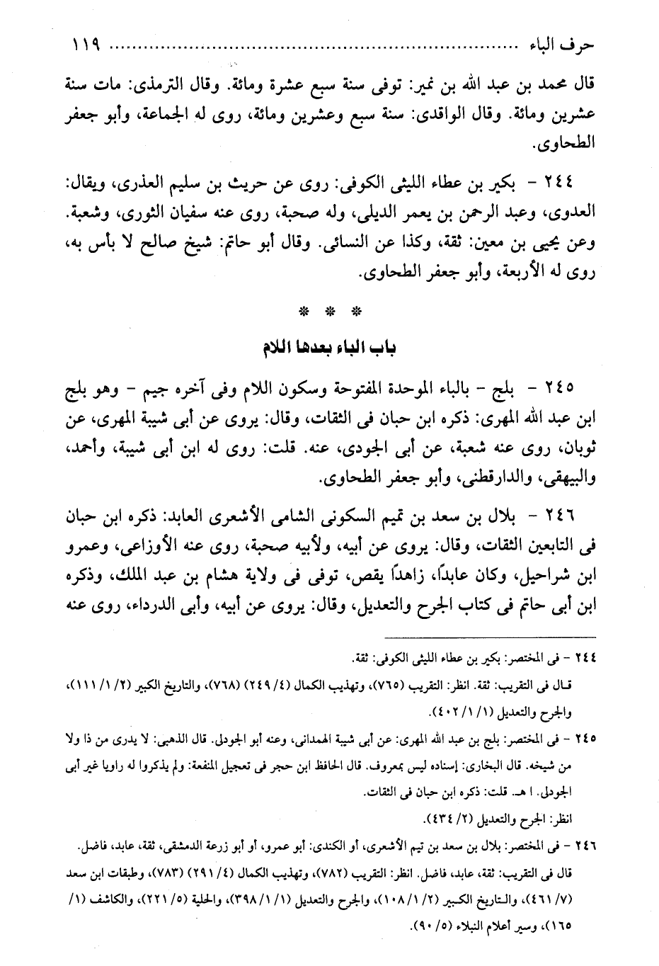 245 - فى المختصر: بلج بن عبد الله المهرى: عن أبى شيبة الهمدانى، وعنه أبو الجودلى. قال الذهبى: لا يدرى من ذا ولا من شيخه. قال البخارى: إسناده ليس بمعروف. قال الحافظ ابن حجر فى تعجيل المنفعة: ولم يذكروا له راويا غير أبى الجودلى. ا. هـ. قلت: ذكره ابن حبان فى الثقات.