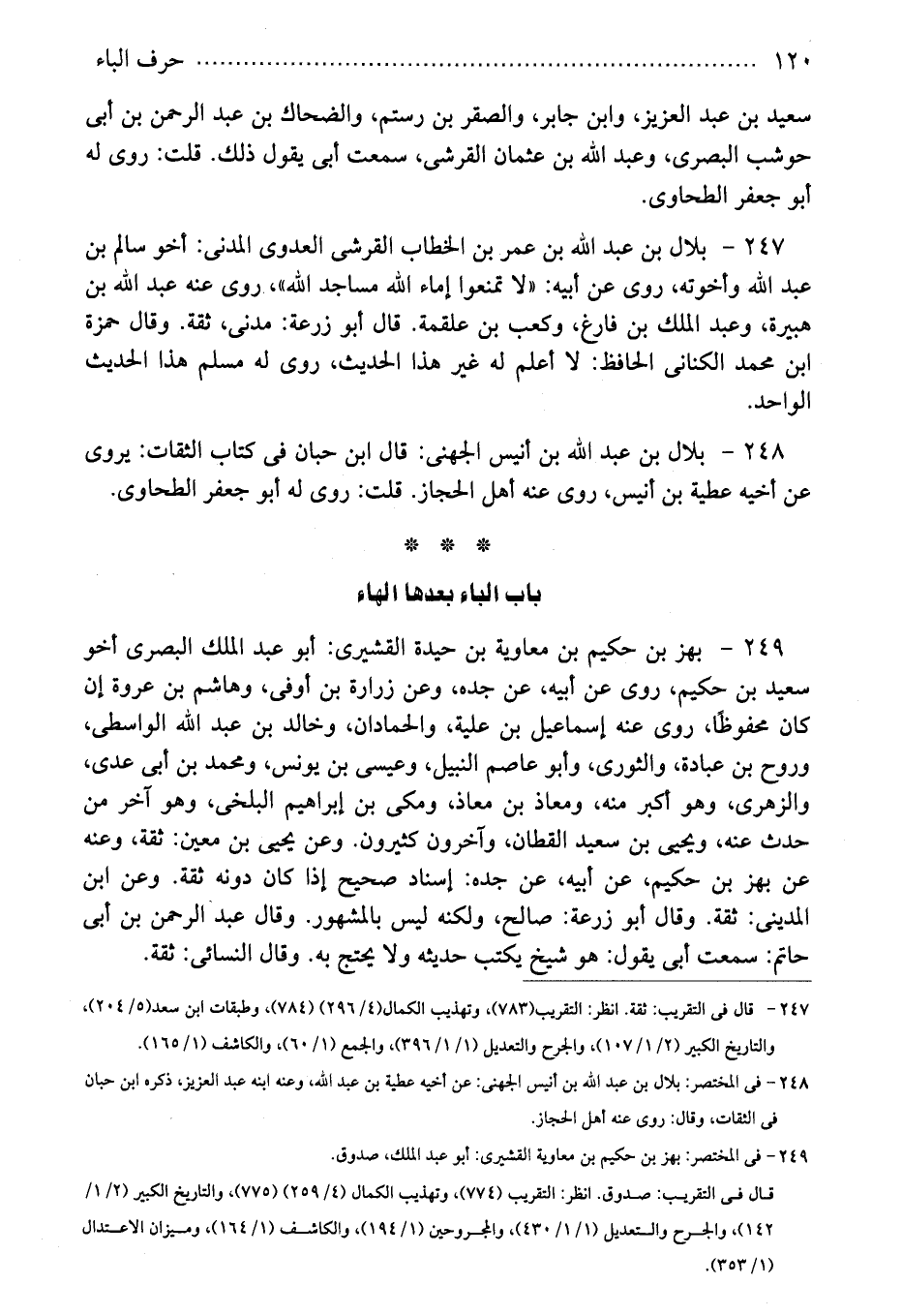 248 - بلال بن عبد الله بن أنيس الجهنى: قال ابن حبان فى كتاب الثقات: يروى عن أخيه عطية بن أنيس، روى عنه أهل الحجاز. قلت: روى له أبو جعفر الطحاوى.