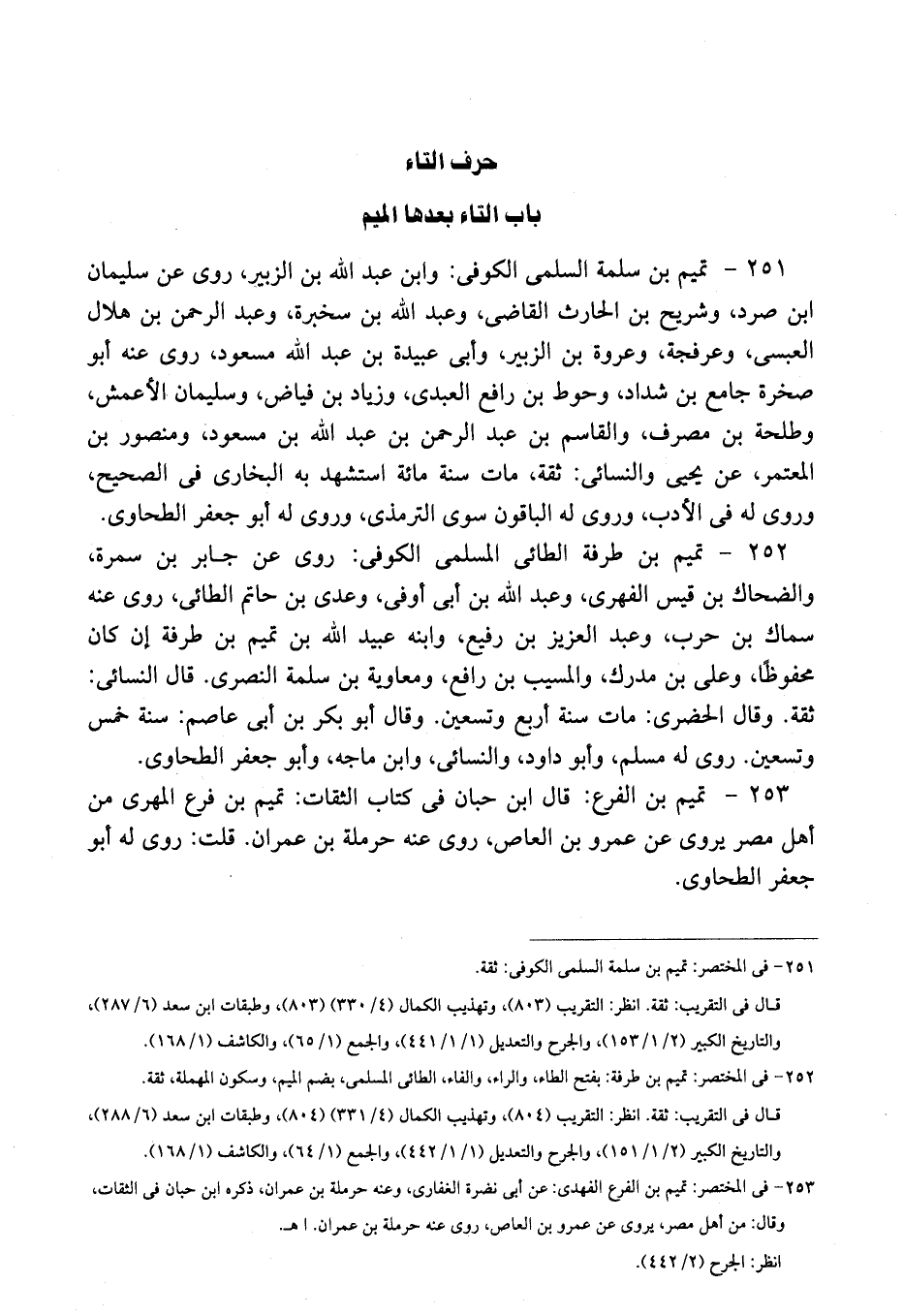 252 - فى المختصر: تميم بن طرفة: بفتح الطاء، والراء، والفاء، الطائى المسلمى، بضم الميم، وسكون المهملة، ثقة.