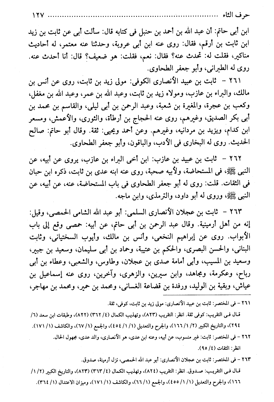 263 - ثابت بن عجلان الأنصارى السلمى: أبو عبد الله الشامى الحمصى، وقيل: إنه من أهل أرمينية. وقال عبد الرحمن بن أبى حاتم، عن أبيه: حمصى وقع إلى باب الأبواب. روى عن إبراهيم النخعى، وأنس بن مالك، وأيوب السختيانى، وثابت البنانى، والحسن البصرى، والحكم بن عتيبة، وحماد بن أبى سليمان، وسعيد بن جبير، وسعيد بن المسيب، وأبى أمامة صدى بن عجلان، وطاووس، والشعبى، وعطاء بن أبى رباح، وعكرمة، ومجاهد، وابن سيرين، والزهرى، وآخرين، روى عنه إسماعيل بن عياش، وبقية بن الوليد، ورفدة بن قضاعة الغسانى، ومحمد بن حمير، ومحمد بن مهاجر،