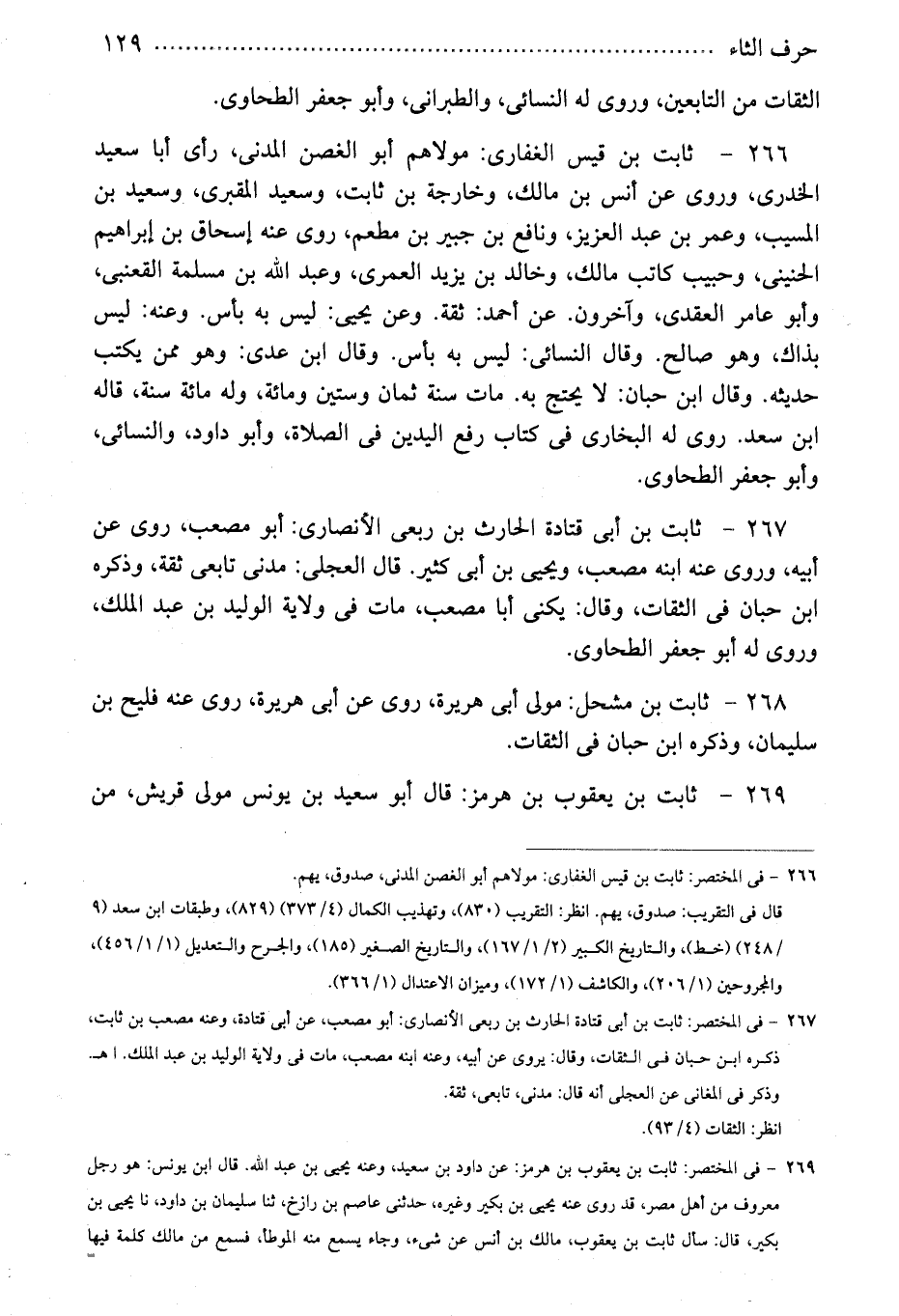 267 - ثابت بن أبى قتادة الحارث بن ربعى الأنصارى: أبو مصعب، روى عن أبيه، وروى عنه ابنه مصعب، ويحيى بن أبى كثير. قال العجلى: مدنى تابعى ثقة، وذكره ابن حبان فى الثقات، وقال: يكنى أبا مصعب، مات فى ولاية الوليد بن عبد الملك، وروى له أبو جعفر الطحاوى.