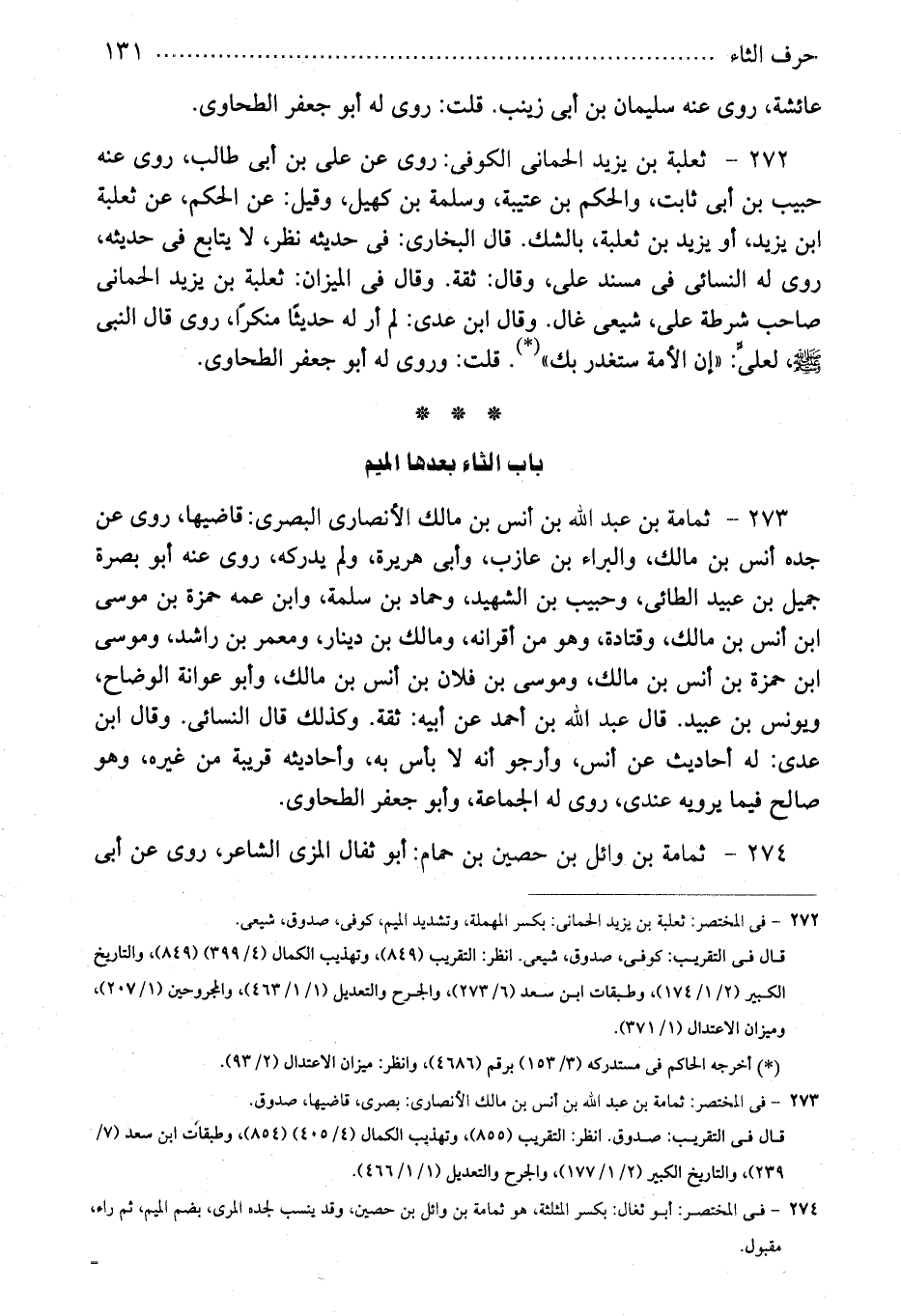 272 - فى المختصر: ثعلبة بن يزيد الحمانى: بكسر المهملة، وتشديد الميم، كوفى، صدوق، شيعى.